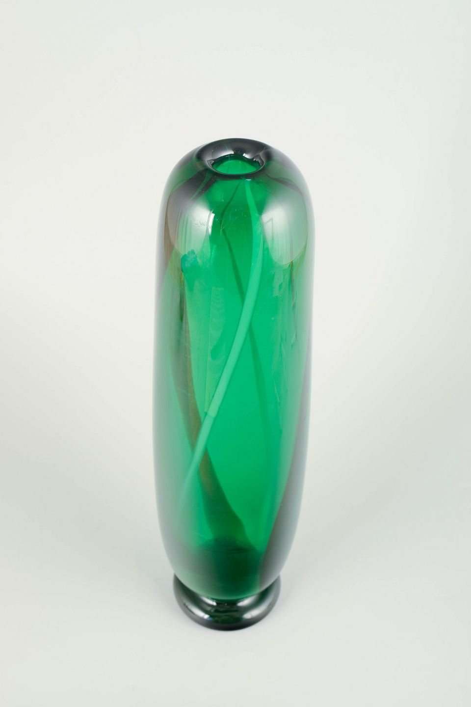 Mundblæst skandinavisk studioglas med tonegradueret farveskift fra blå til grøn. Stor skulpturel dobbeltbalusterform med slank hals.