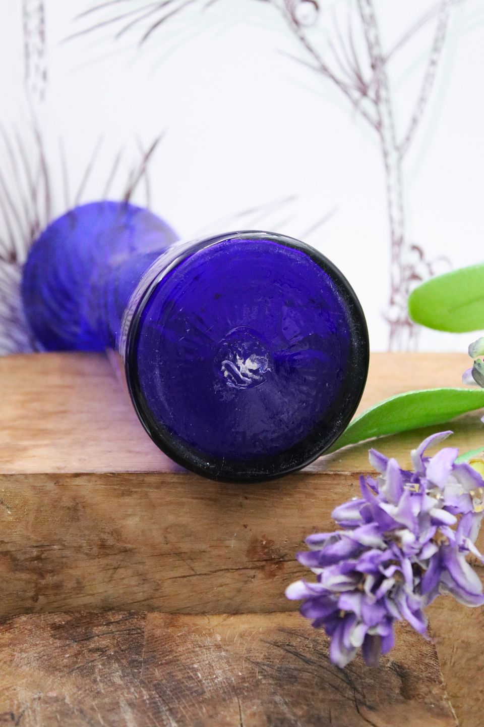 Antikt blåt hyacintglas i mundblæst glas fra Holmegaard glasværk.