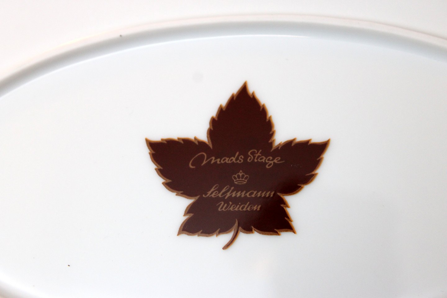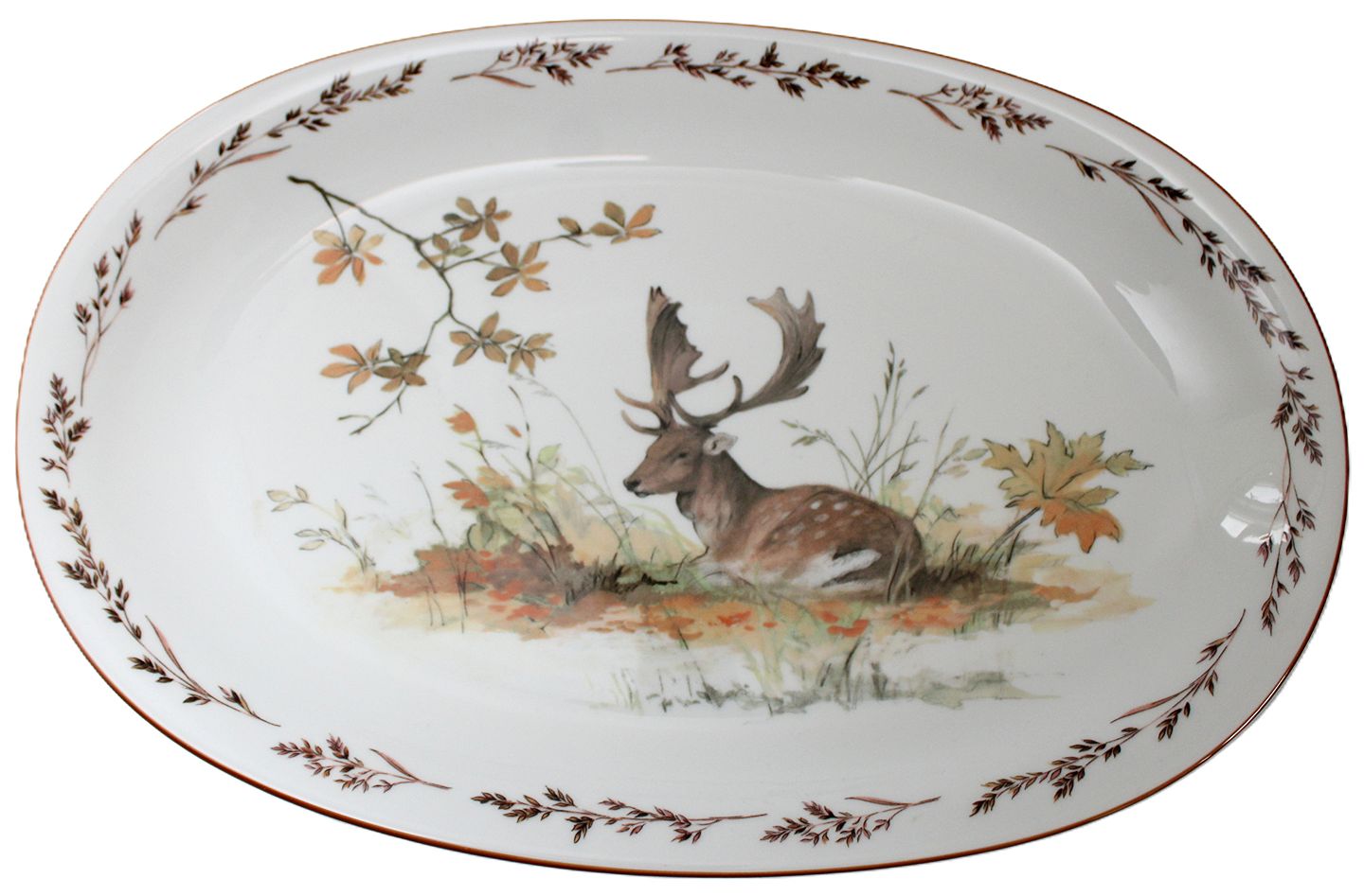 Jagtstellet designet af Mads Stage for Imerco. Ovalt stegefad med Kronhjort. Længde 37 cm. Bredde 24,5 cm. Flot stand. Pris: 725 kr. stk. Lager: 1