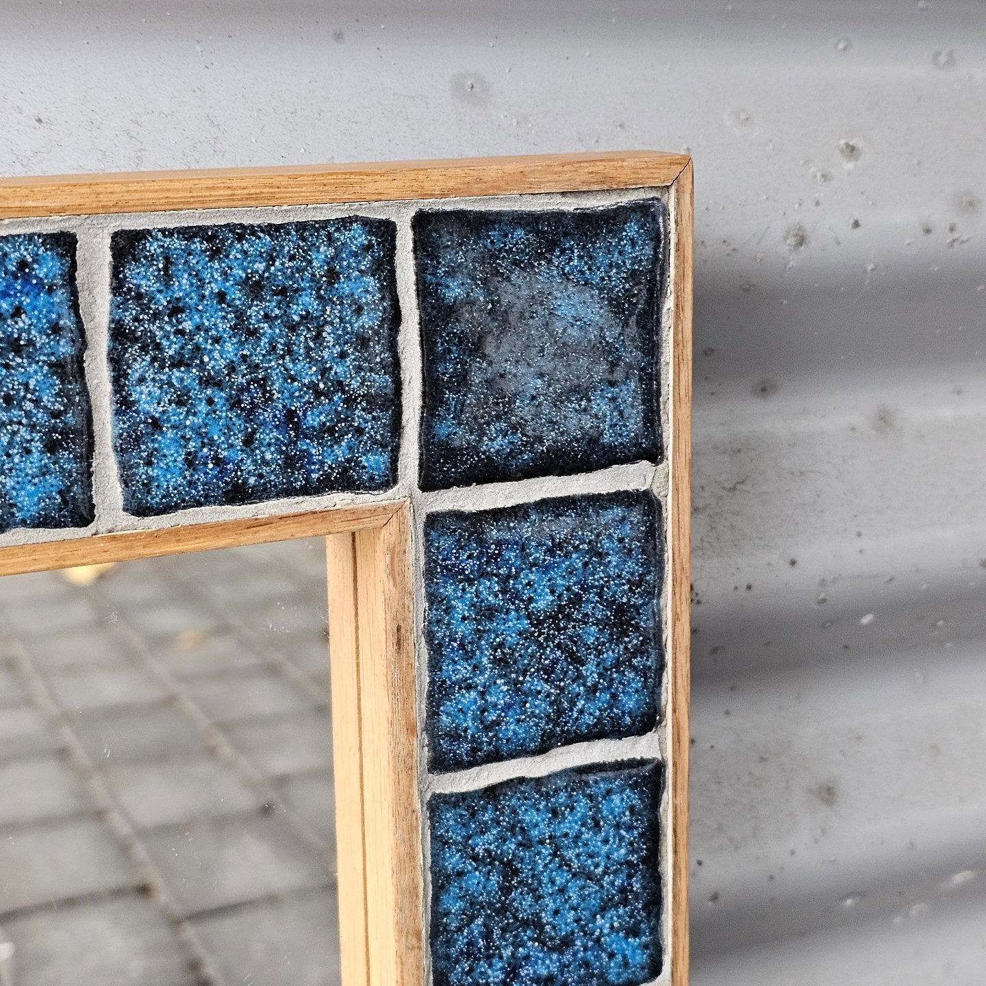 Rektangulært spejl med ramme dekoreret med blå klinker