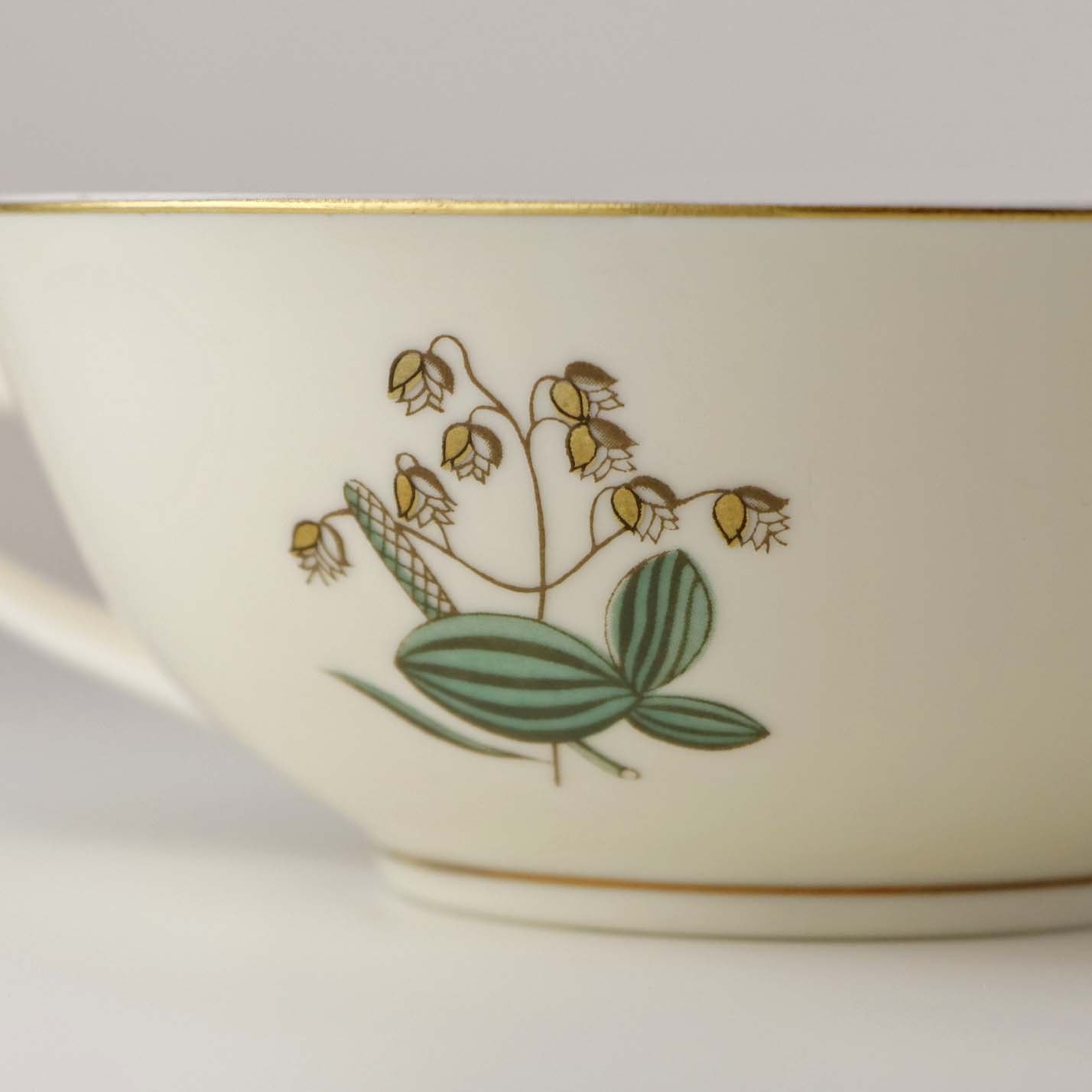 Stel i glat råhvidt porcelæn dekoreret med lysegrøn stribe og guldkant samt motiv af hjertegræs.