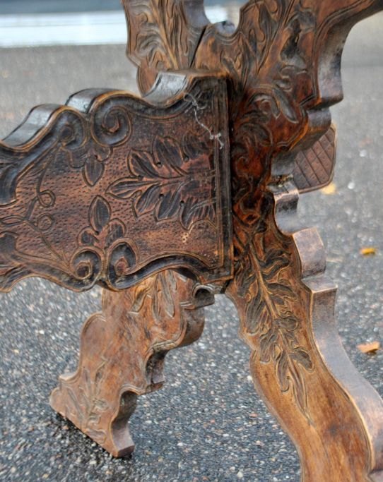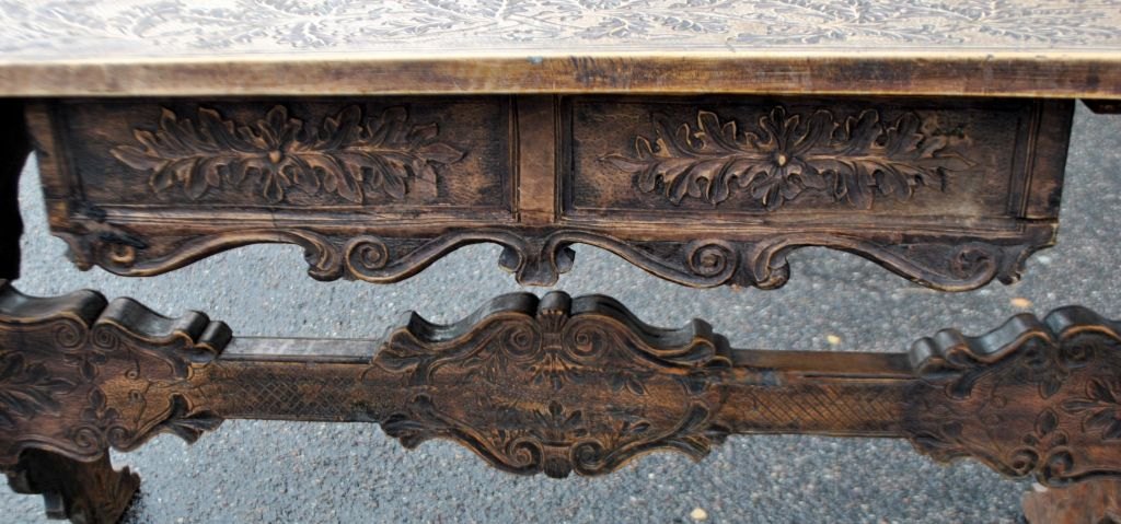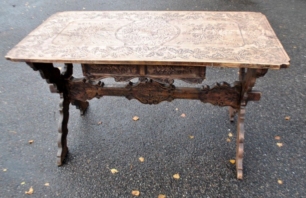 Antikt langbord med skæringer og skuffe, 19. årh. Utallige skæringer på plade, skuffe, ben og understel. I midten udskæring af hertug krone. Antagelig Tyskland. L.: 141 cm. B.: 73 cm. D.: 77 cm.