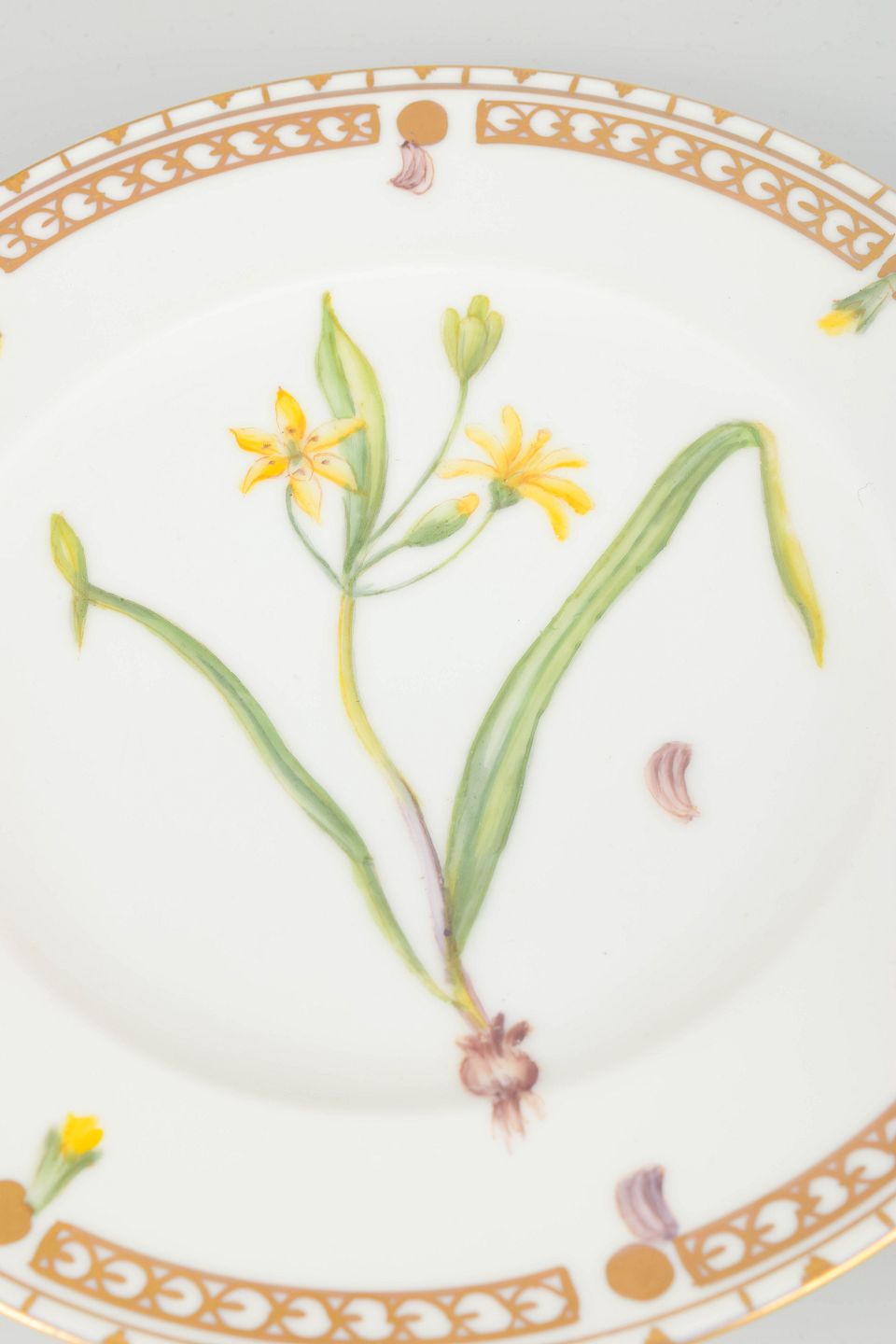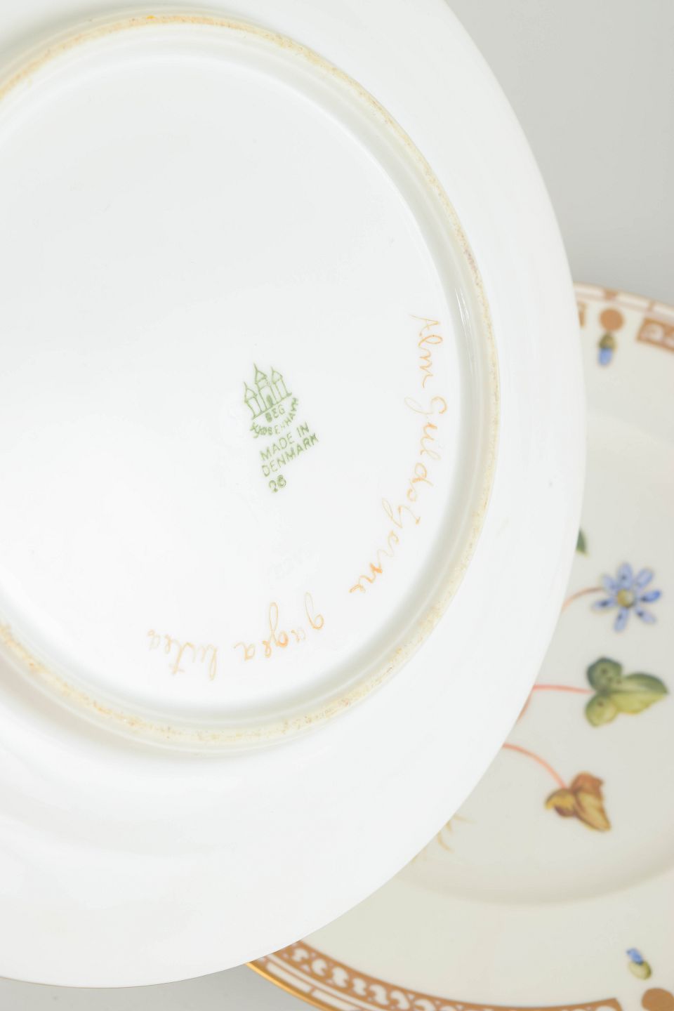 To porcelænstallerkener med håndmalede botaniske motiver og guldbemaling langs kanten. 2. sortering.
