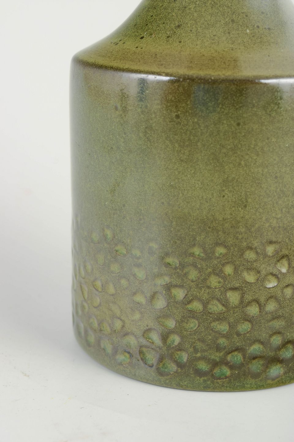 Cylindrisk stentøjsvase med todelt glasur — øverste halvdel med brun, geometrisk rutet reliefstruktur og nederste del med lys gul, taktil lavaglasur. Klassisk eksempel på Atterbergs kombination af taktile overflader og nordisk farvepoesi.
