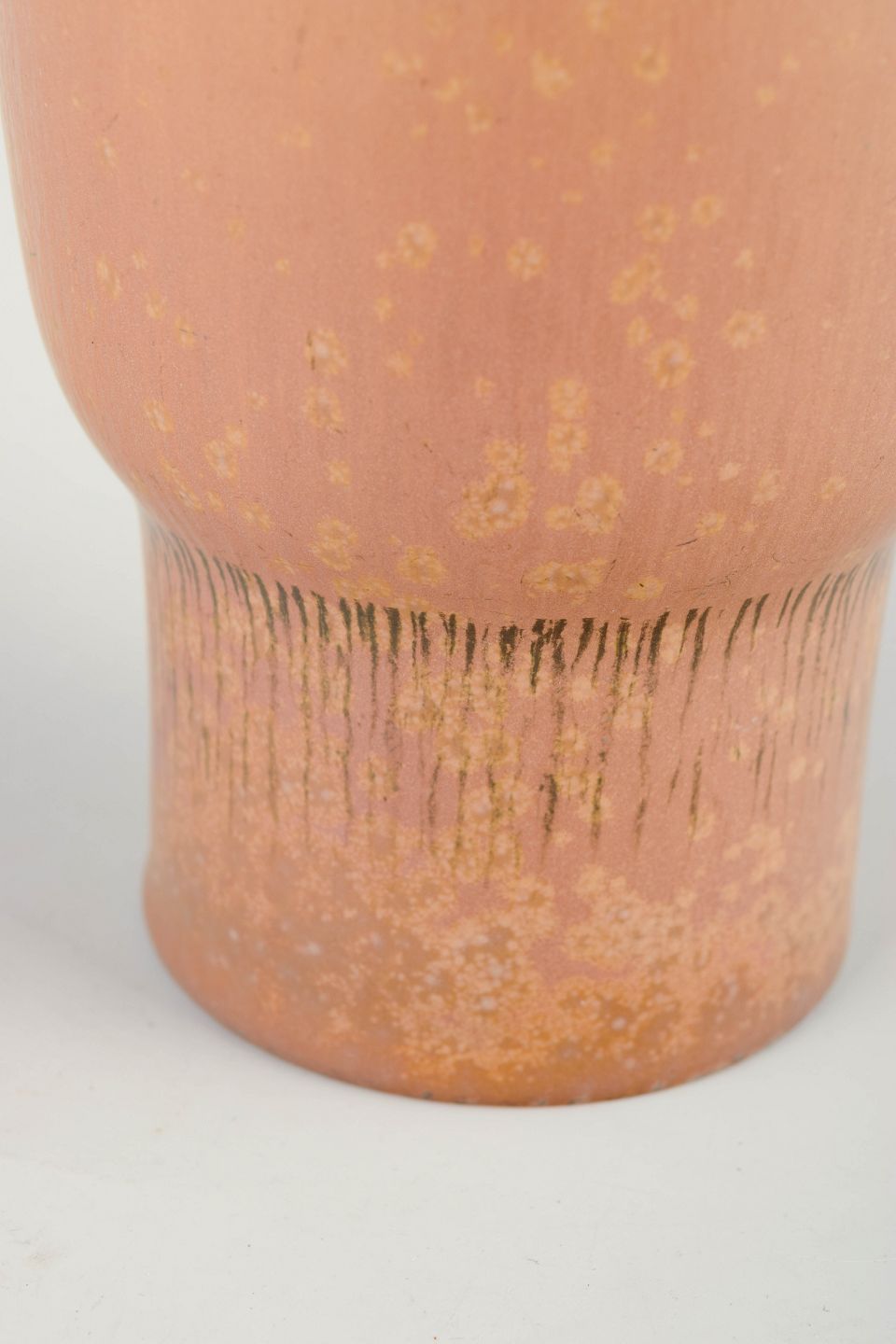 Minimalistisk cylindrisk vase i drejet stentøj med lys varmrosa glasur med fine eksperimentelle nuancer og lodret riflet struktur mod foden — et karakteristisk eksempel på Stålhane’s afdæmpede modernisme.