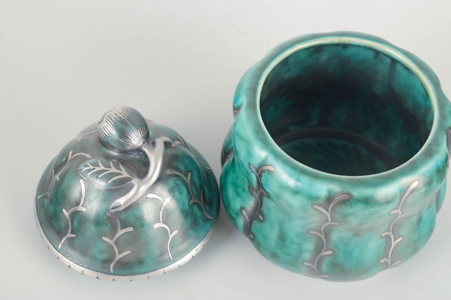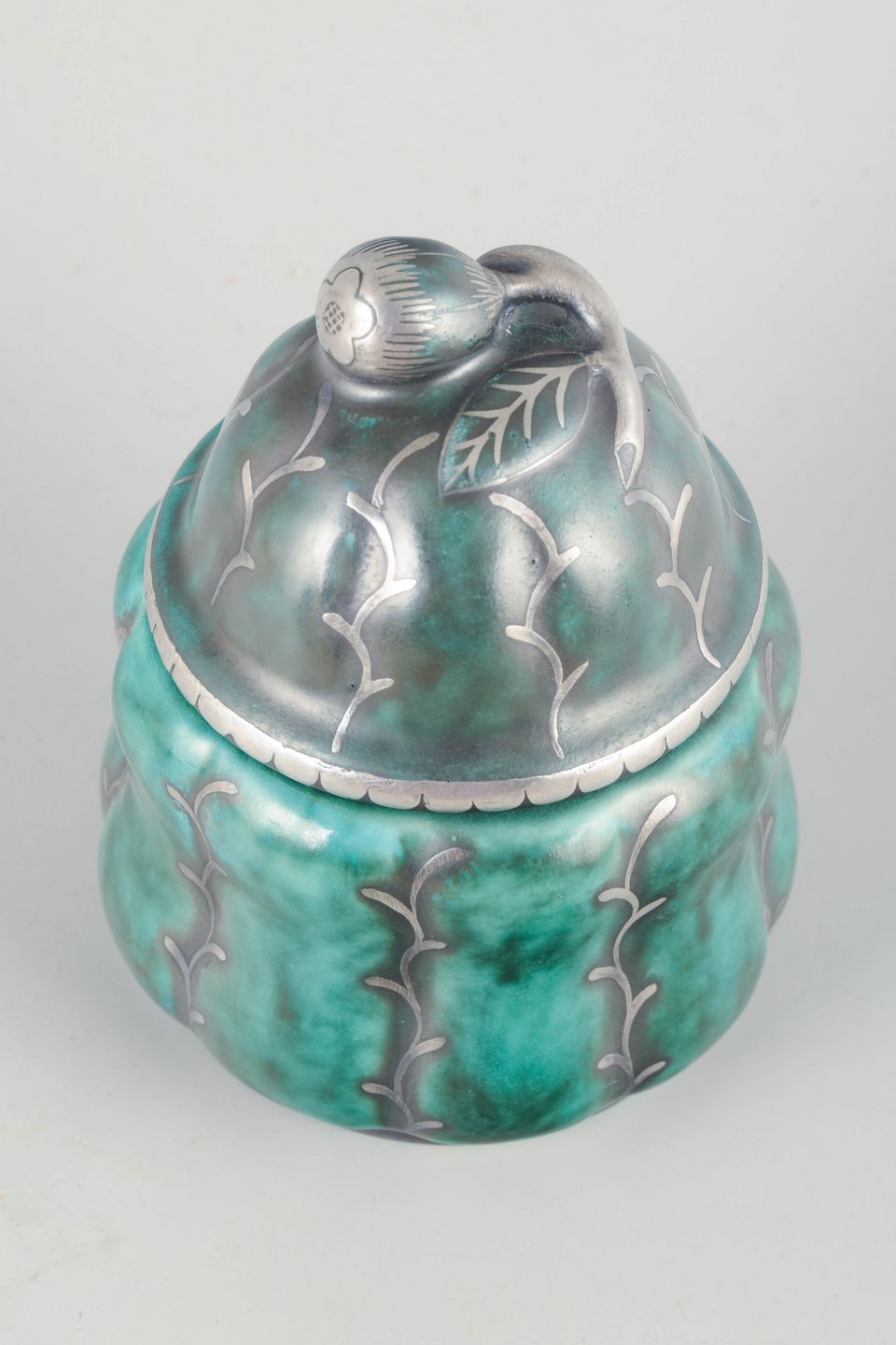 Art Deco lågkrukke i stentøj med turkis glasur og indlagt sølvdekoration, organisk svunget korpus og karakteristisk forhøjet låg med botanisk reliefmotiv og figurativ knop. (Model 851)