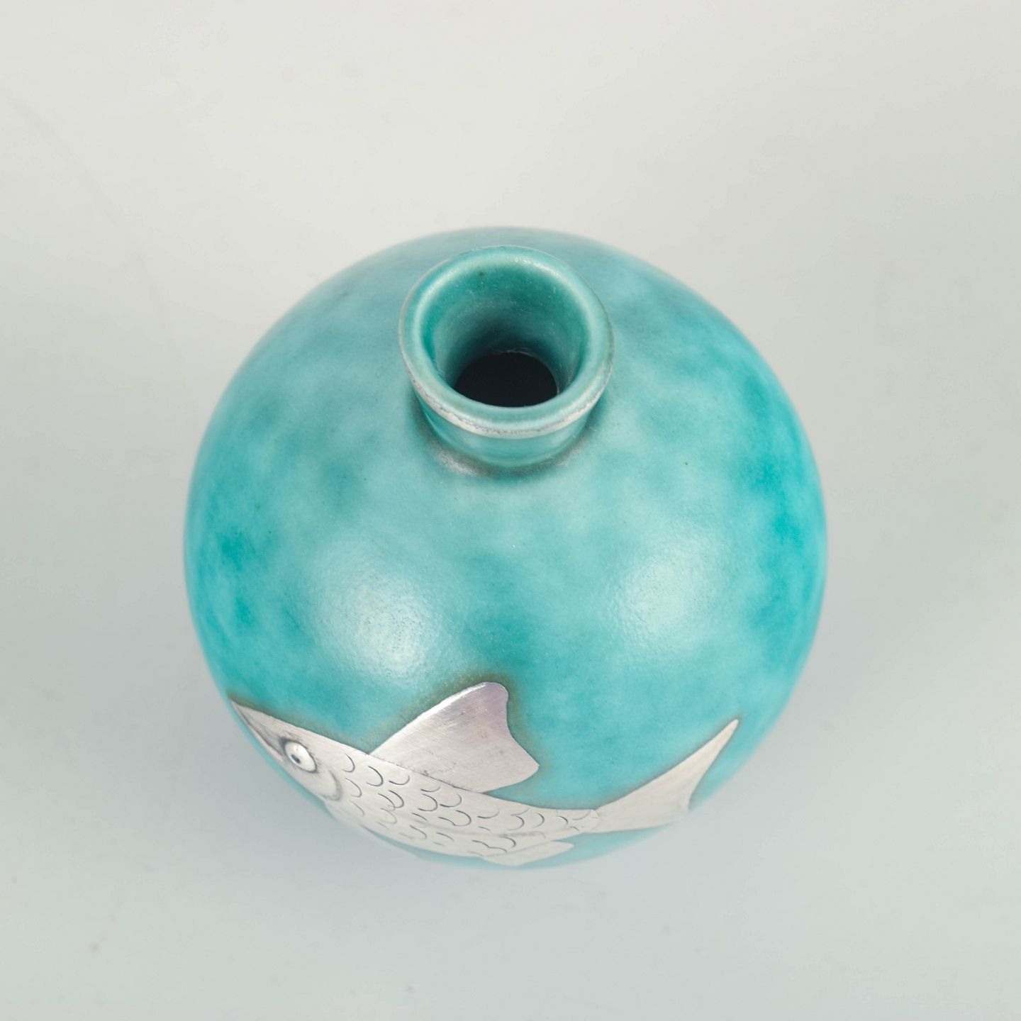 Lille rund Art Deco-vase i stentøj med karakteristisk turkis glasur og indlagt sølvfiskemotiv — et ikonisk kendetegn for Kåges Argenta-arbejder.