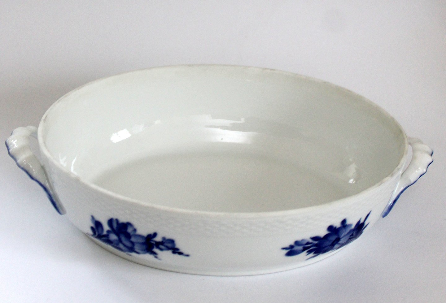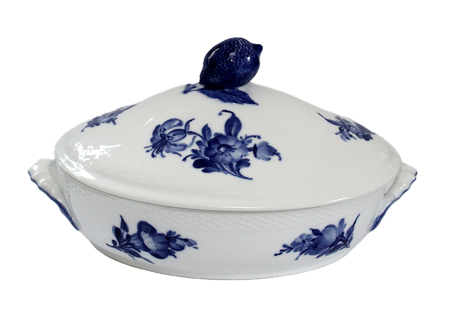 Royal Copenhagen, Blå Blomst flettet, Oval terrin med låg. Nr. 10/8172. Dateret 1945. Højde 15,5 cm. Længde 27,5 cm. Bredde 18 cm. I. sortering med sort brændingsplet på undersiden af låget. Pris: 1500 kr. stk. Lager: 1