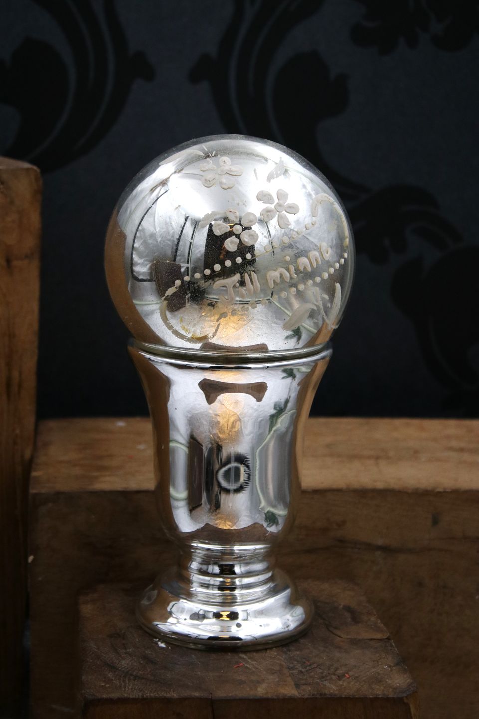 Svensk 1800 tals mindekugle i fattigmandssølv med bemalet blomster og skrift "Til Minne" Dia.: 12cm.