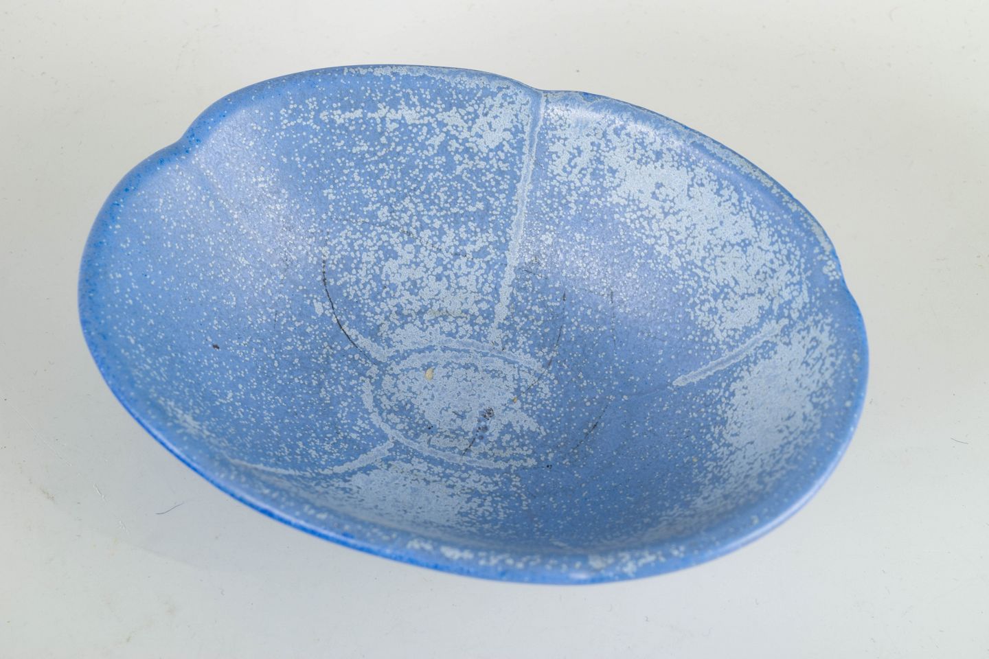 Elegant stentøjsskål med blød, organisk form og matblå glasur med fint spættet overflade — et karakteristisk eksempel på Nylunds sans for proportioner og subtile farvetoner. Skålen udstråler den rolige modernisme, som prægede Rörstrand i midten af det 20. århundrede.