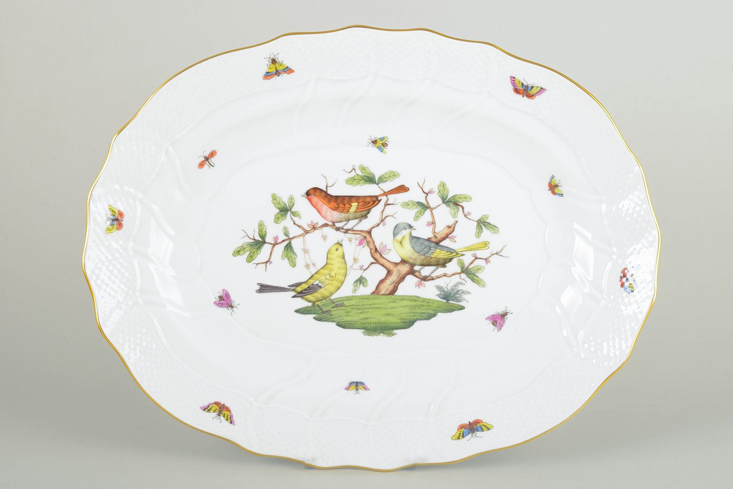 Stort ovalt serveringsfad i håndmalet porcelæn med motiv af fugle på gren og sommerfugle, kantet med forgyldt rand. Klassisk Herend-dekoration i fine farver og detaljeret penselføring.