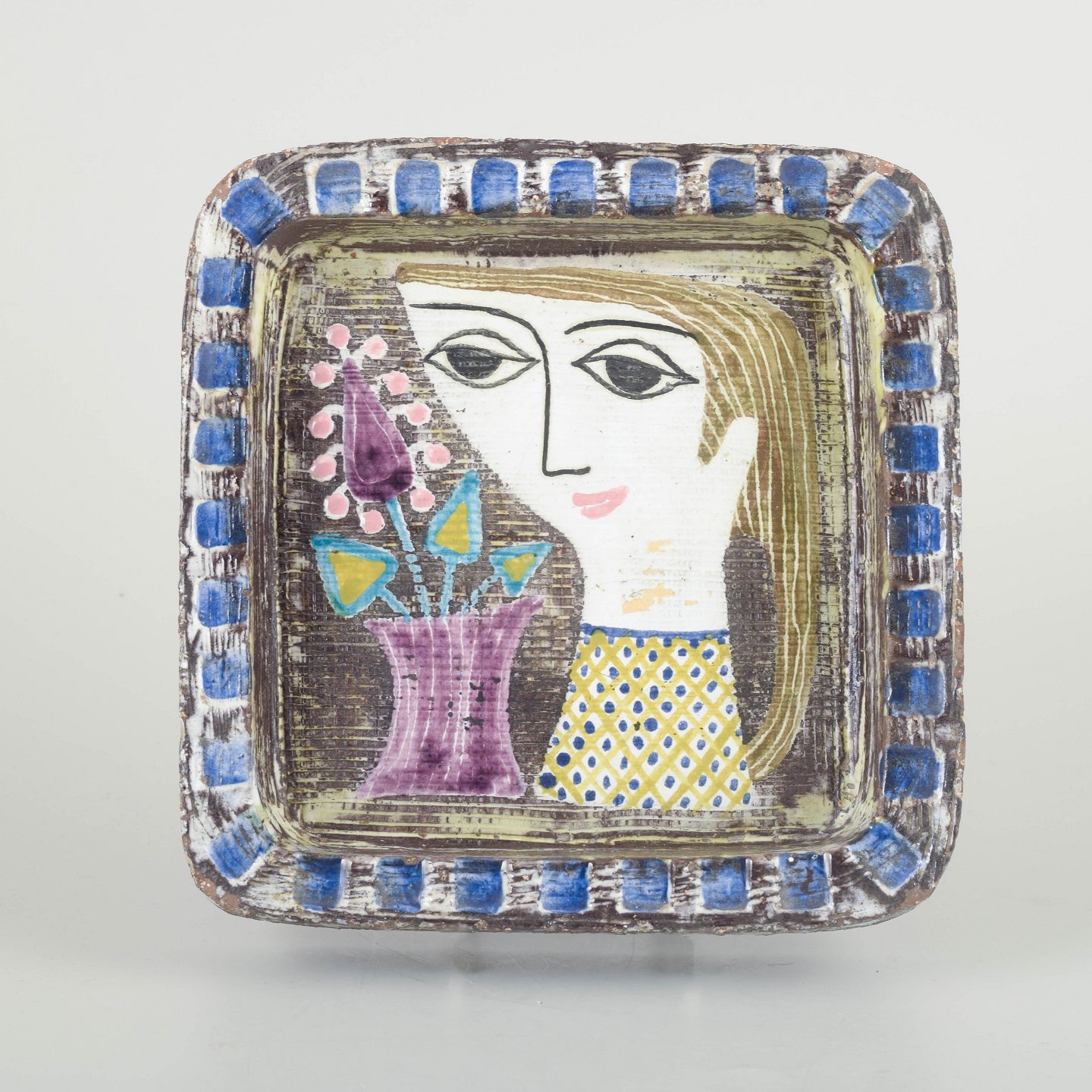 Rektangulært relief-fad i chamotte-stentøj med håndmalet motiv af kvinde og vase i lilla, blå og gule toner. Designet med Simmulsons karakteristiske kombination af modernistisk stil og varm, humanistisk udtryksform.