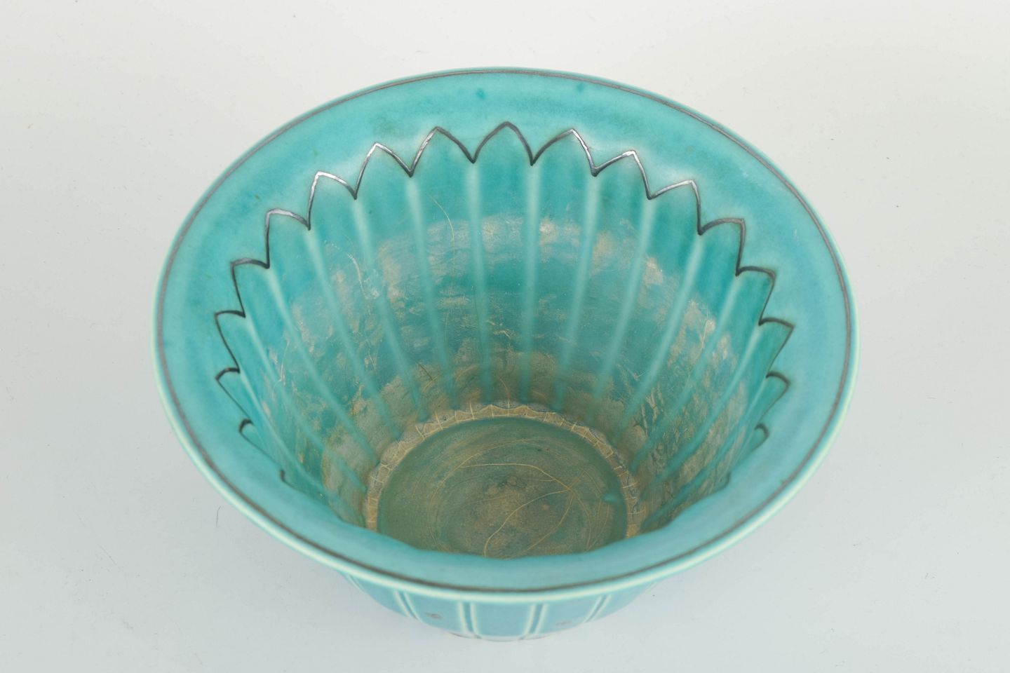 Stentøj med turkis glasur og indlagte sølvdetaljer. Dekoreret med lodrette rifler og små sølvindlagte blomster langs siderne samt scalloperet kant. Klassisk tidlig Argenta med tydelig art deco-formgivning. Let kalkbelægning i bunden.