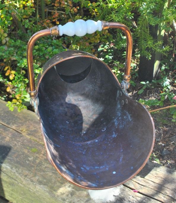 Antik kobber kulspand, 19. årh. På rund fod. Med håndtag i hvidt opaline glas. L: 49cm. H: 33 cm. Højde med håndtag: 47 cm.