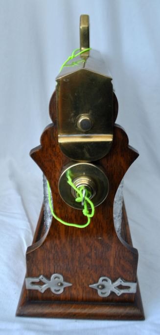 Engelsk tantalus med tre karafler, 19. årh. Poleret egetræ med messingbeslag og lås med nøgle. Stemplet. H: 30 cm. L: 35 cm.