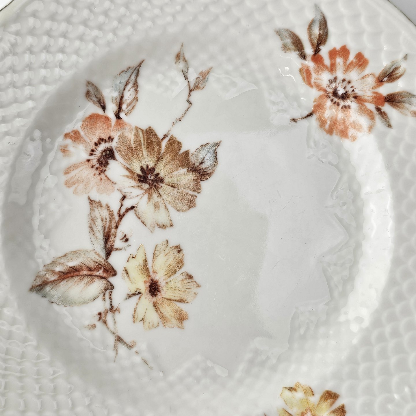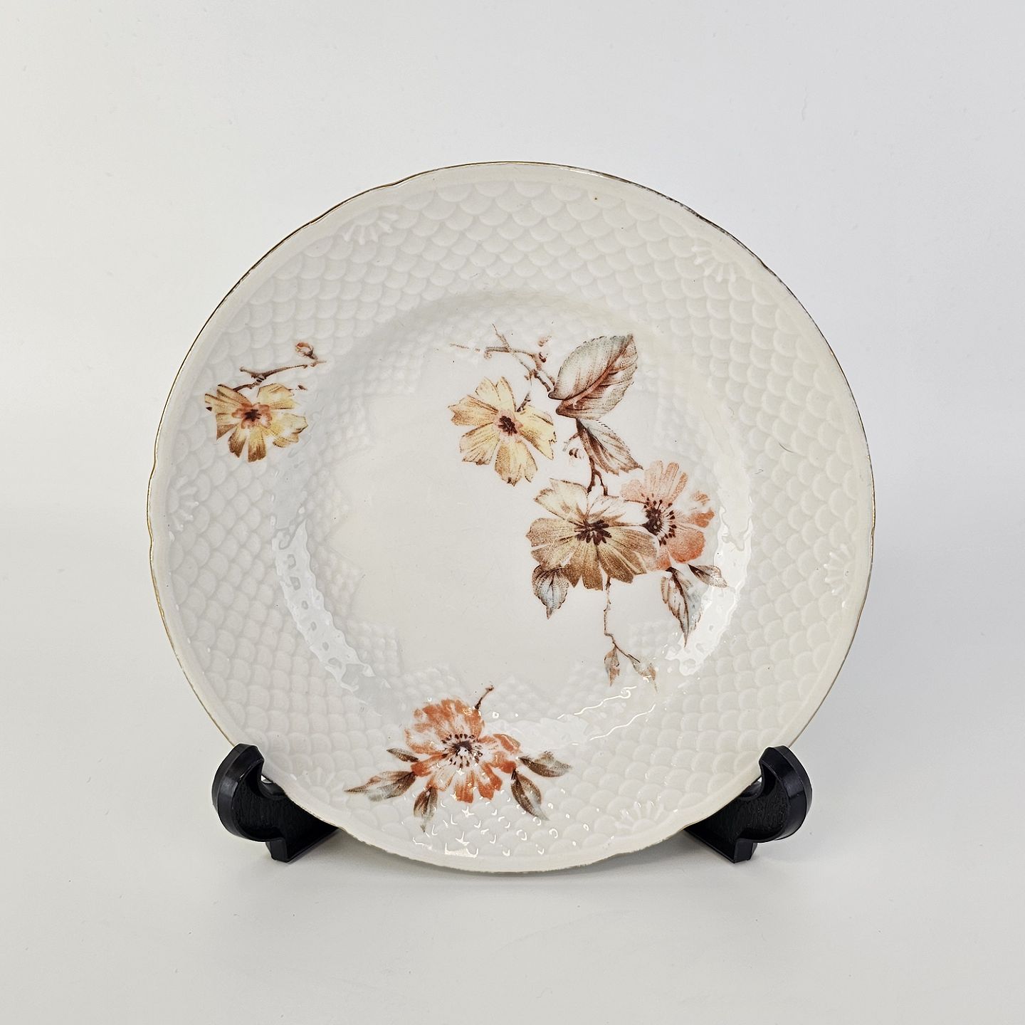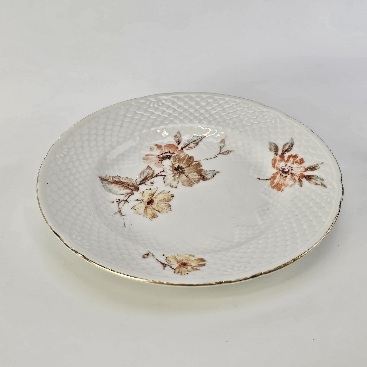 Tallerken i cremefarvet porcelæn med skælmønster og guldkant med blomstermotiv