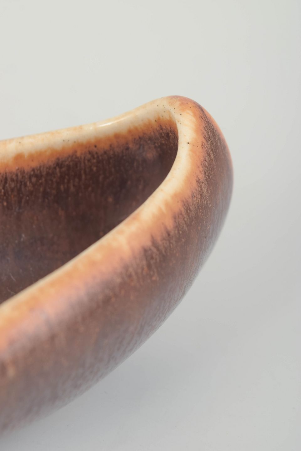 Organisk formet stentøjsskål med blødt afrundet kant og varm brun glasur med subtile nuancer i beige og rav. Et elegant eksempel på Saxbos karakteristiske kombination af enkle linjer og raffineret glasurarbejde.