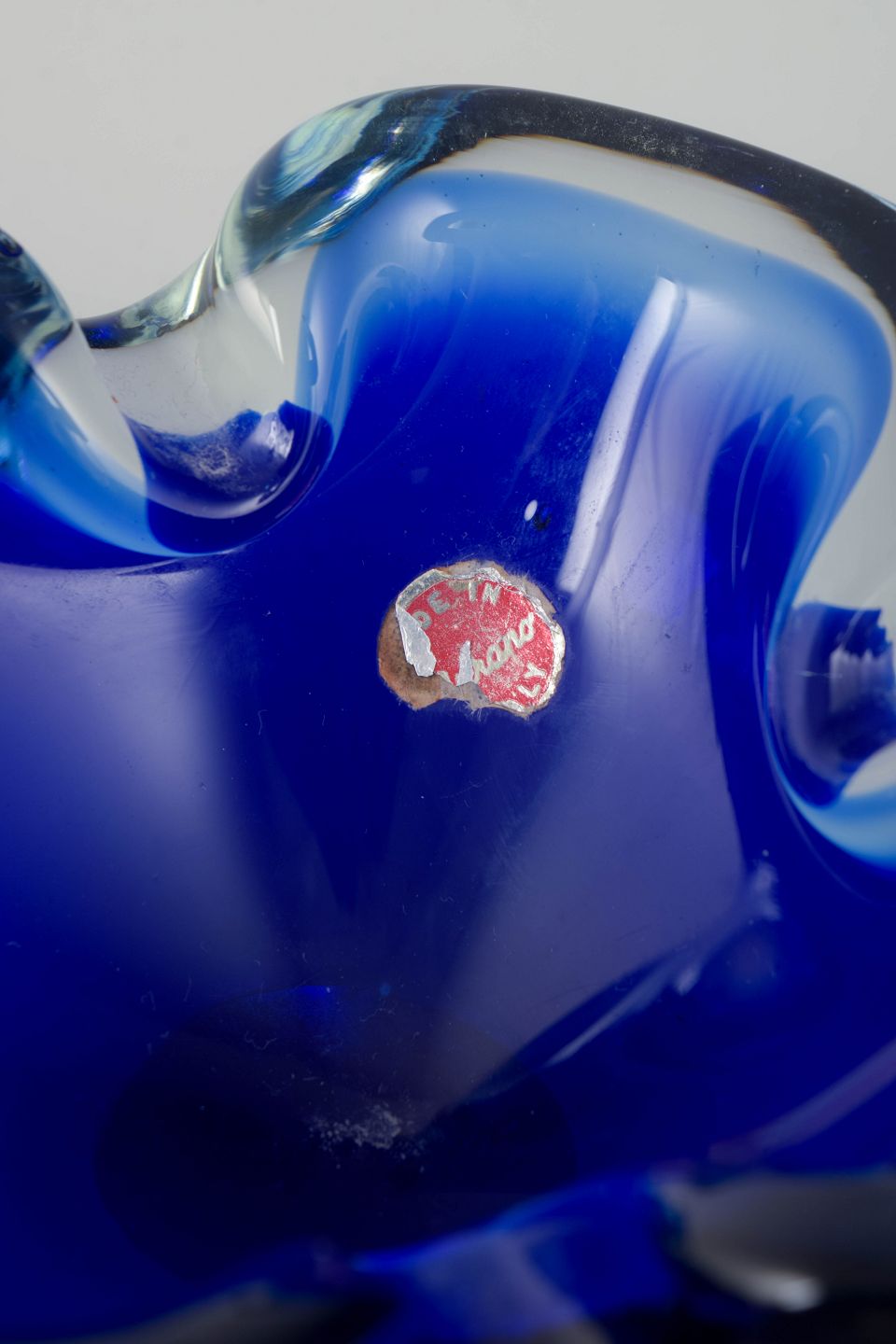 Organisk formet art glass-skål i håndblæst glas med kraftige folder og dyb koboltblå farve, med rester af originalt Made in Murano Italy label.