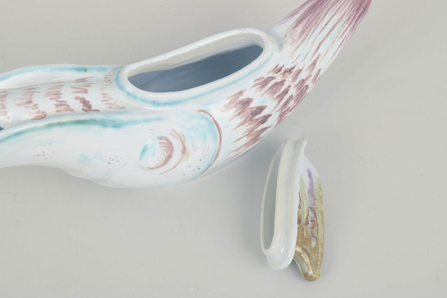 Figurativ sovseskål i form af en fugl, udført i fajance med håndmalet dekoration i lyseblå, rosa og gyldne toner. Et karakteristisk eksempel på Aluminia’s legende formsprog i midten af det 20. århundrede.
