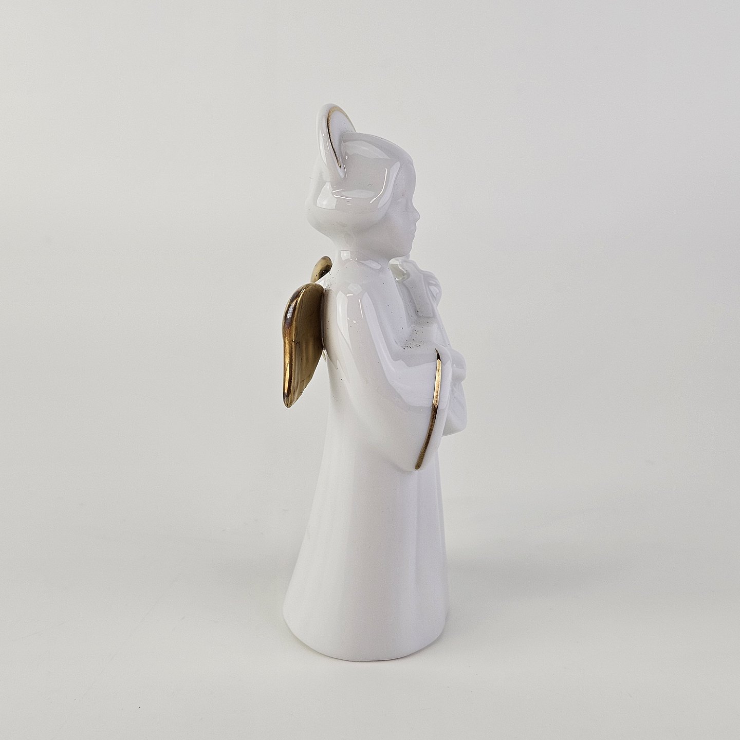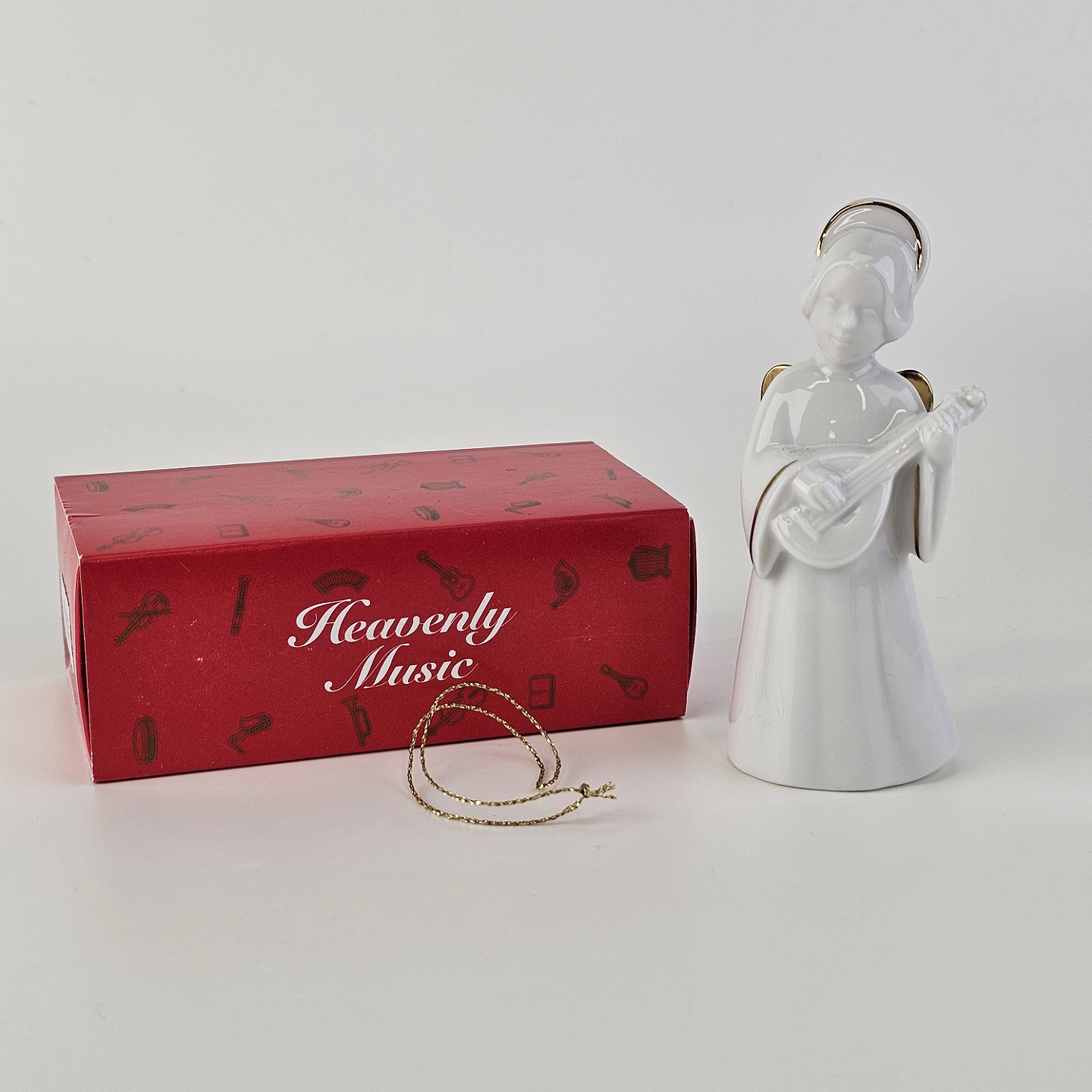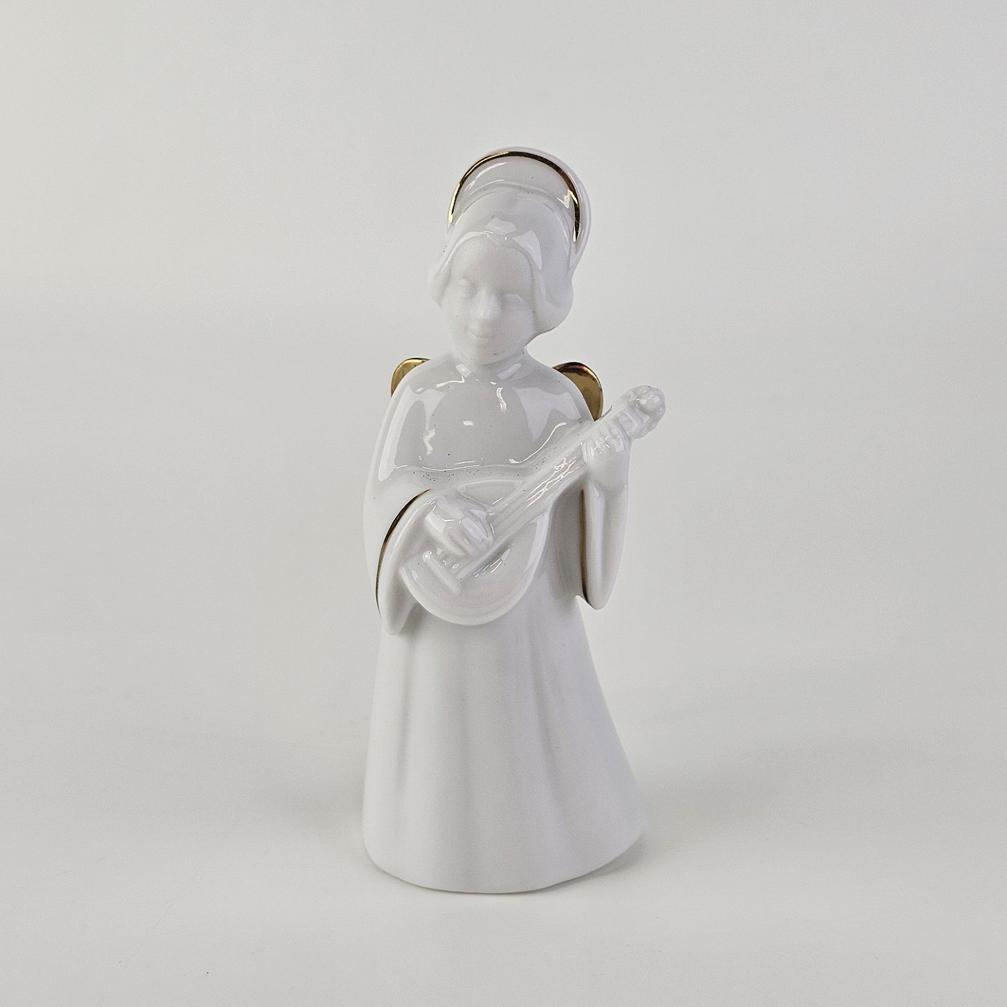 Figur med motiv af en engel som spiller på mandolin. Figuren er i hvidt porcelæn med forgyldte vinger og detaljer i 24 karat guld.
