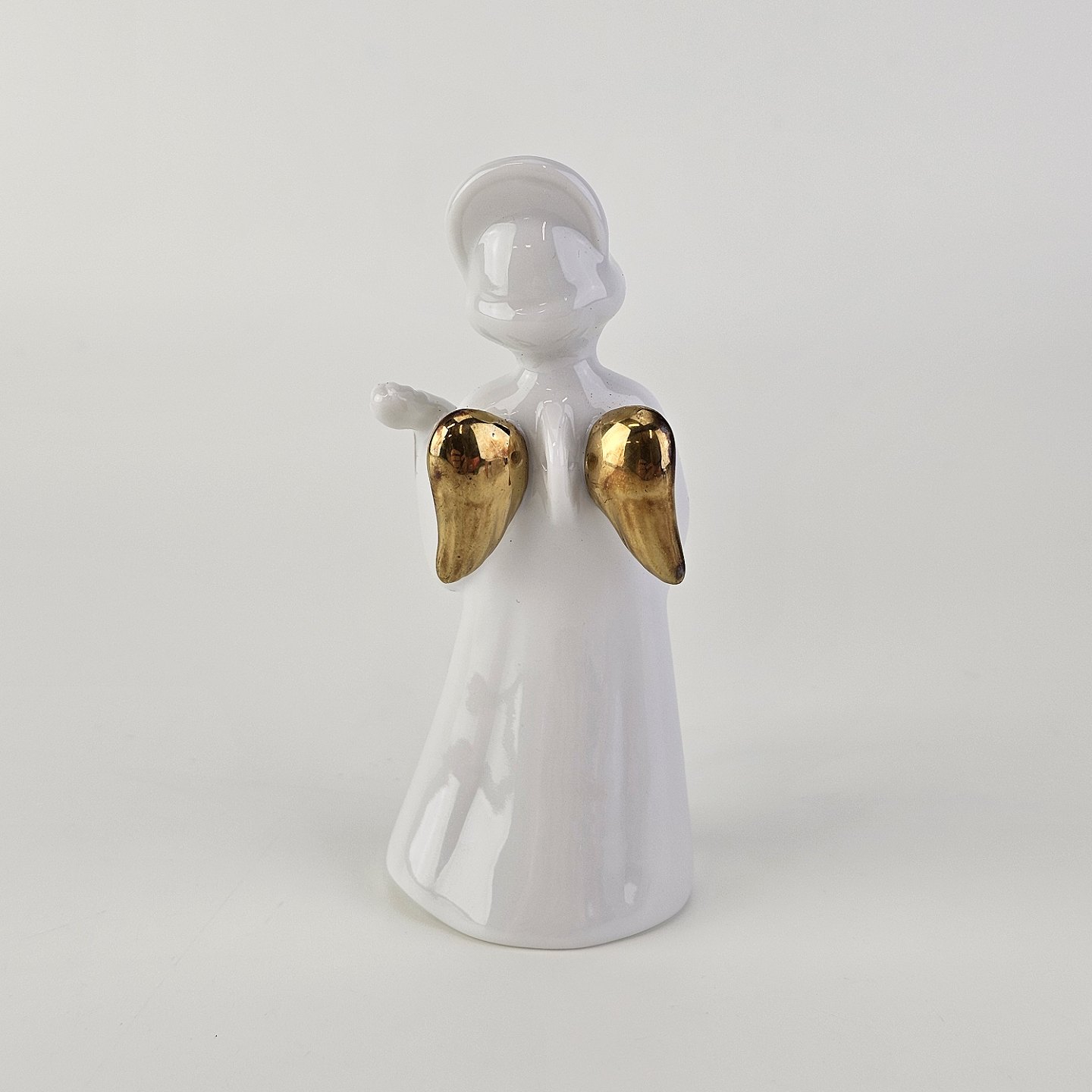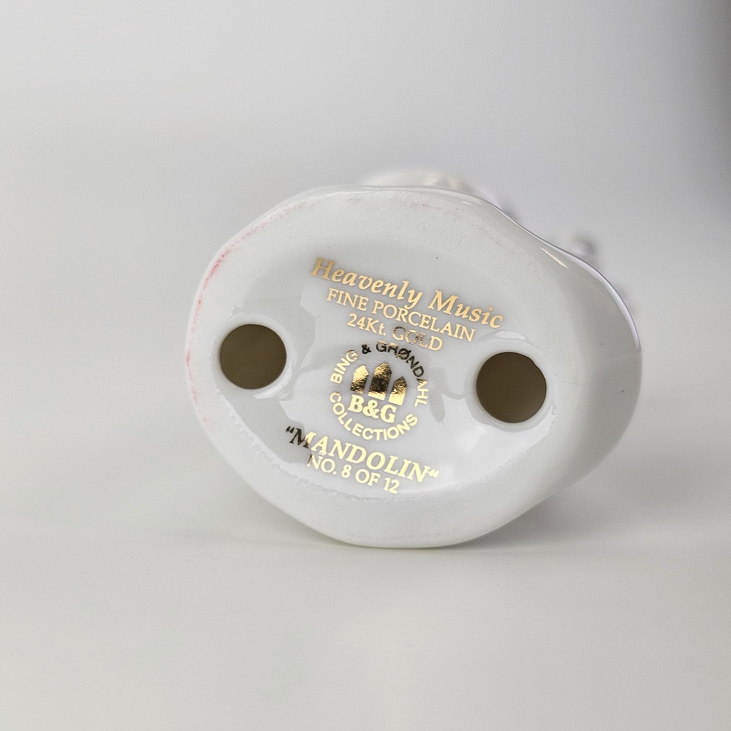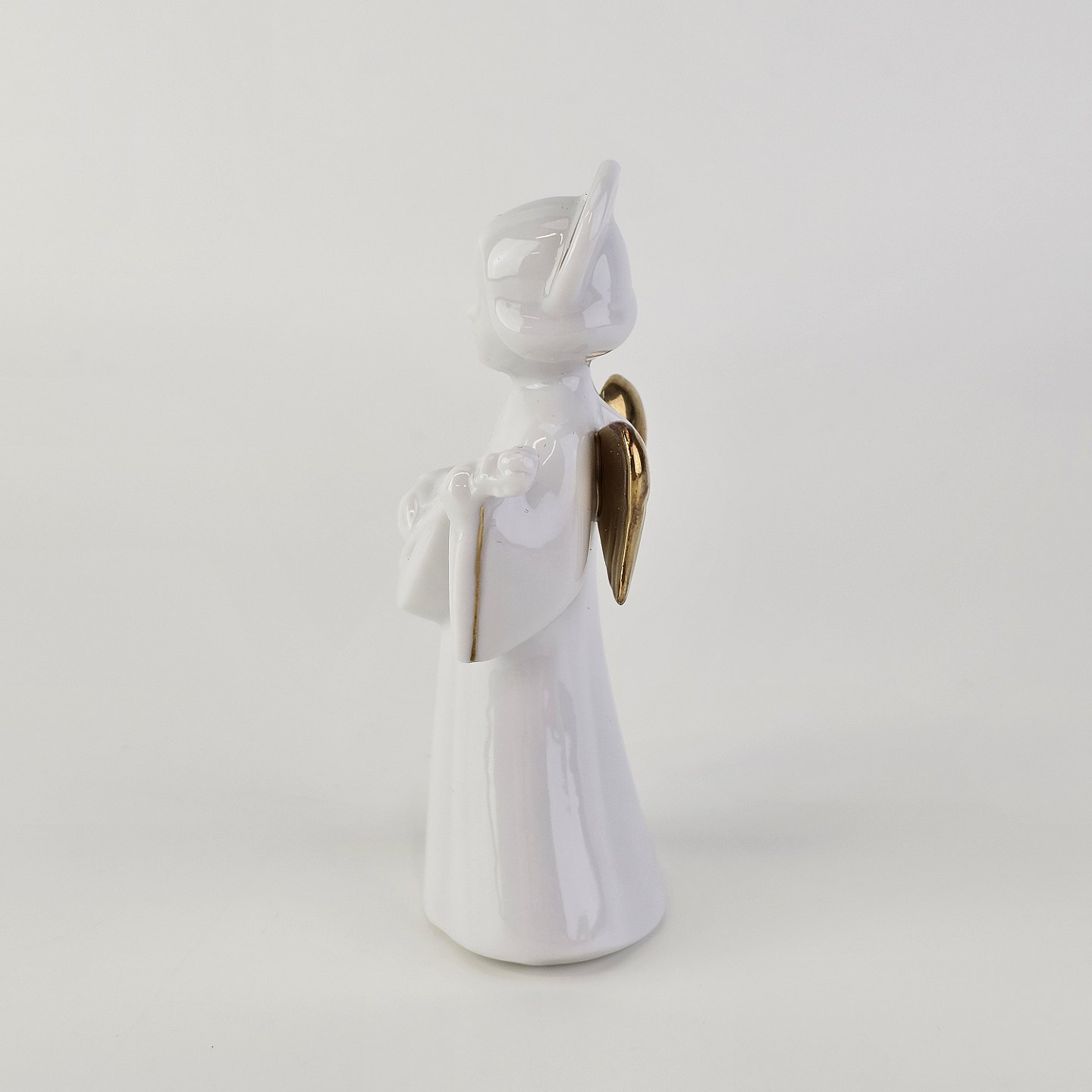 Figur med motiv af en engel som spiller på mandolin. Figuren er i hvidt porcelæn med forgyldte vinger og detaljer i 24 karat guld.