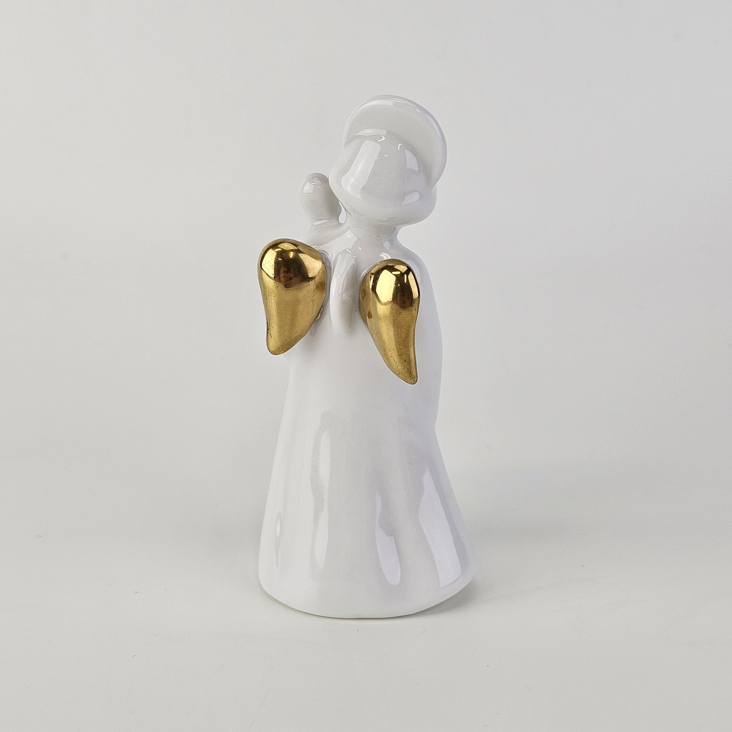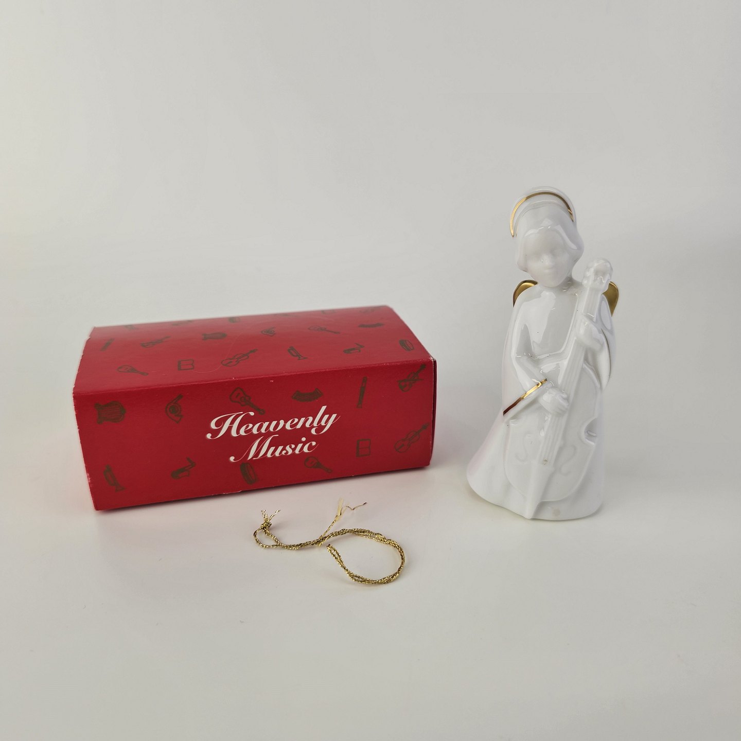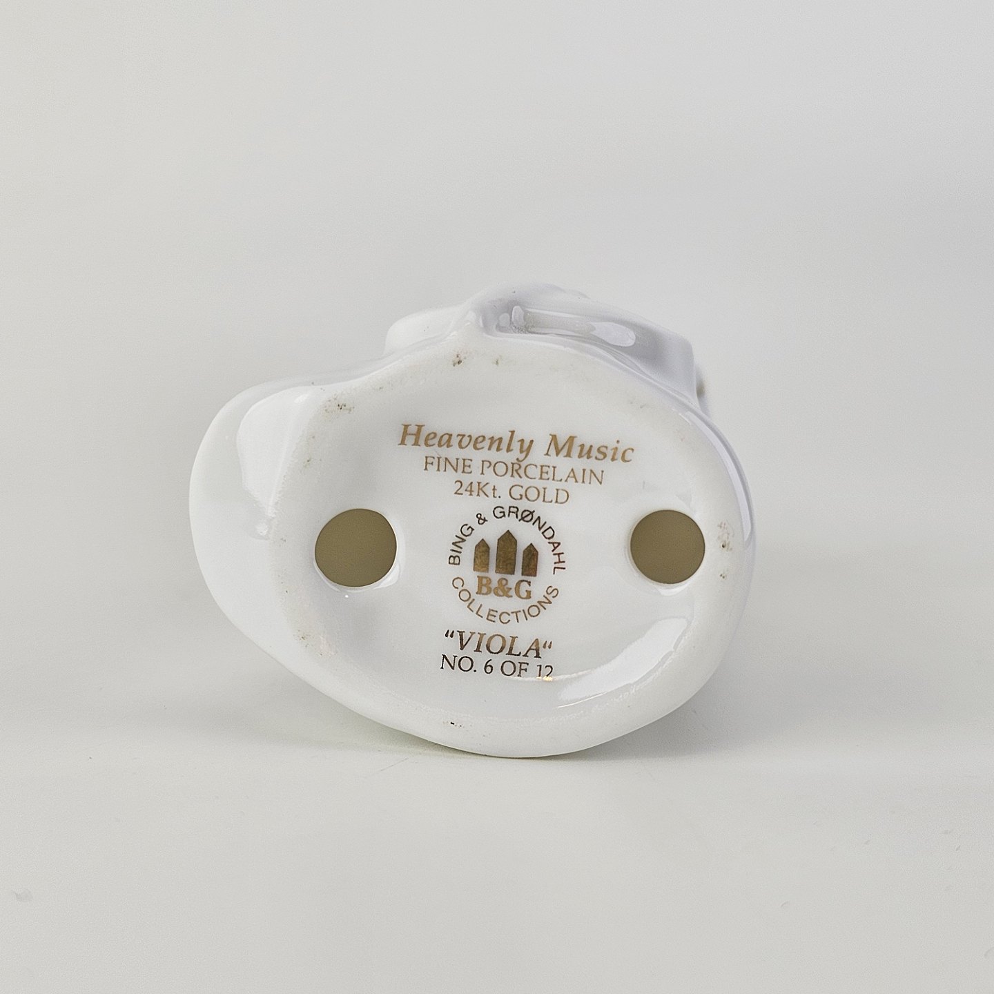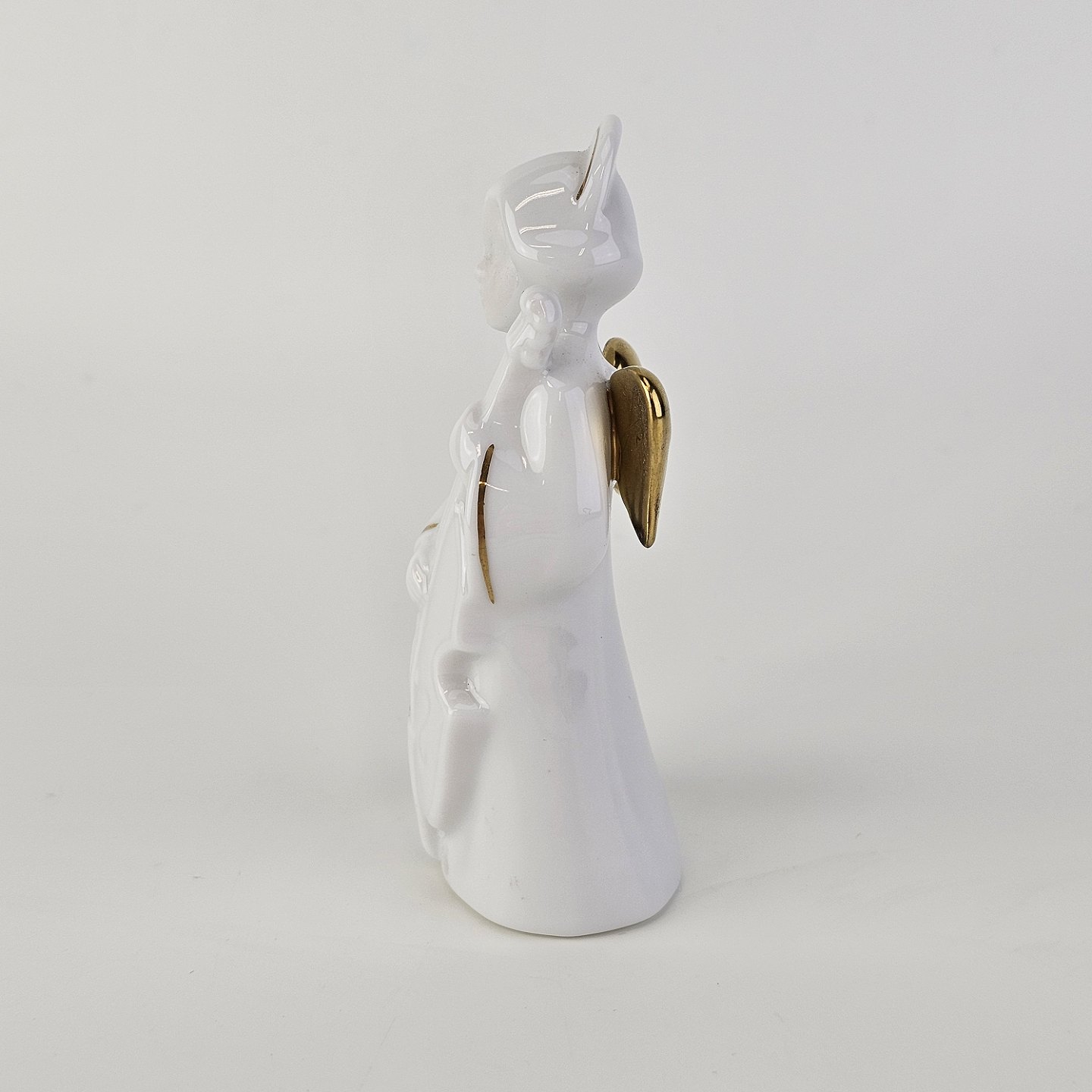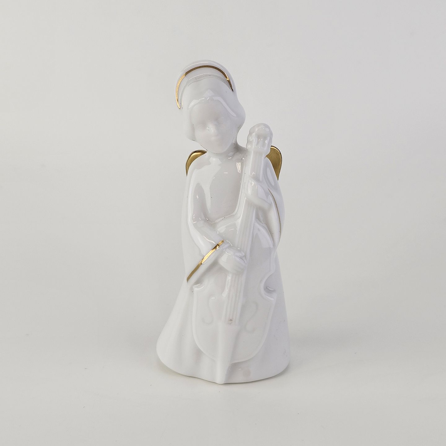 Figur med motiv af en engel som spiller på viola. Figuren er i hvidt porcelæn med forgyldte vinger og detaljer i 24 karat guld.