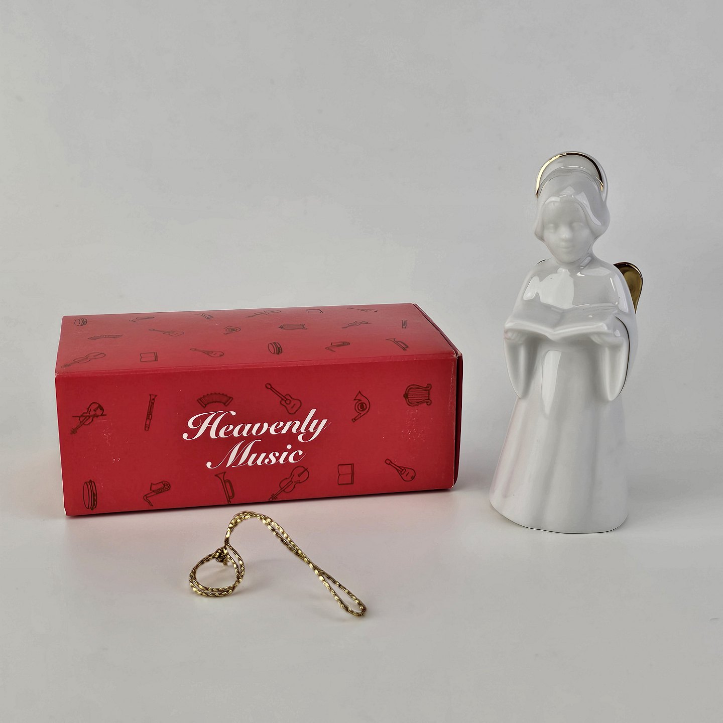 Figur med motiv af en engel med en sandbog. Figuren er i hvidt porcelæn med forgyldte vinger og detaljer i 24 karat guld.