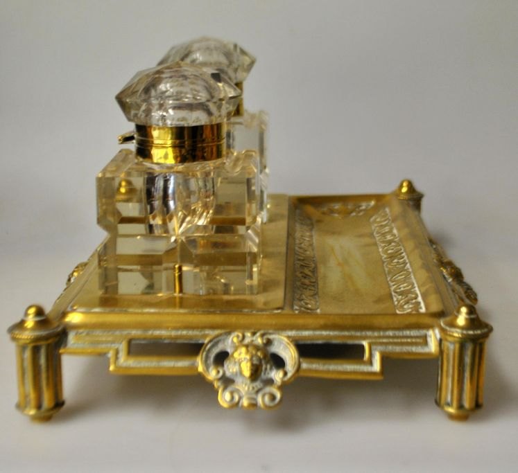 Antikt skrivesæt i messing med krystal beholdere, 19. årh. Tyskland.
