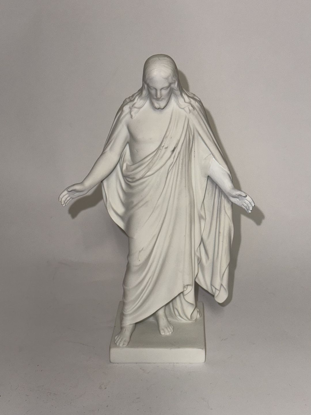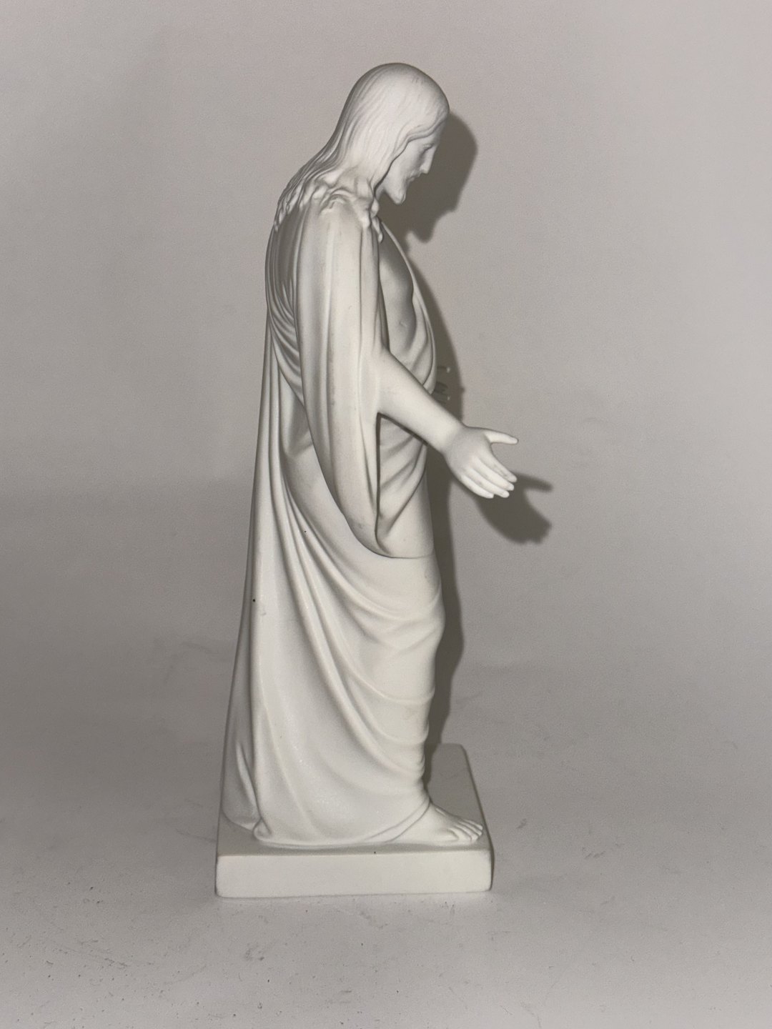 Mindre Jesus kristusfigur i bisquit porcelæn fra Royal Copenhagen fra slutningen af 19. århundrede. Figur udført af Bertel Thorvaldsen (1770-1844). I god stand. Fabriksmærket på bagsiden af soklen. H. 18,7 cm