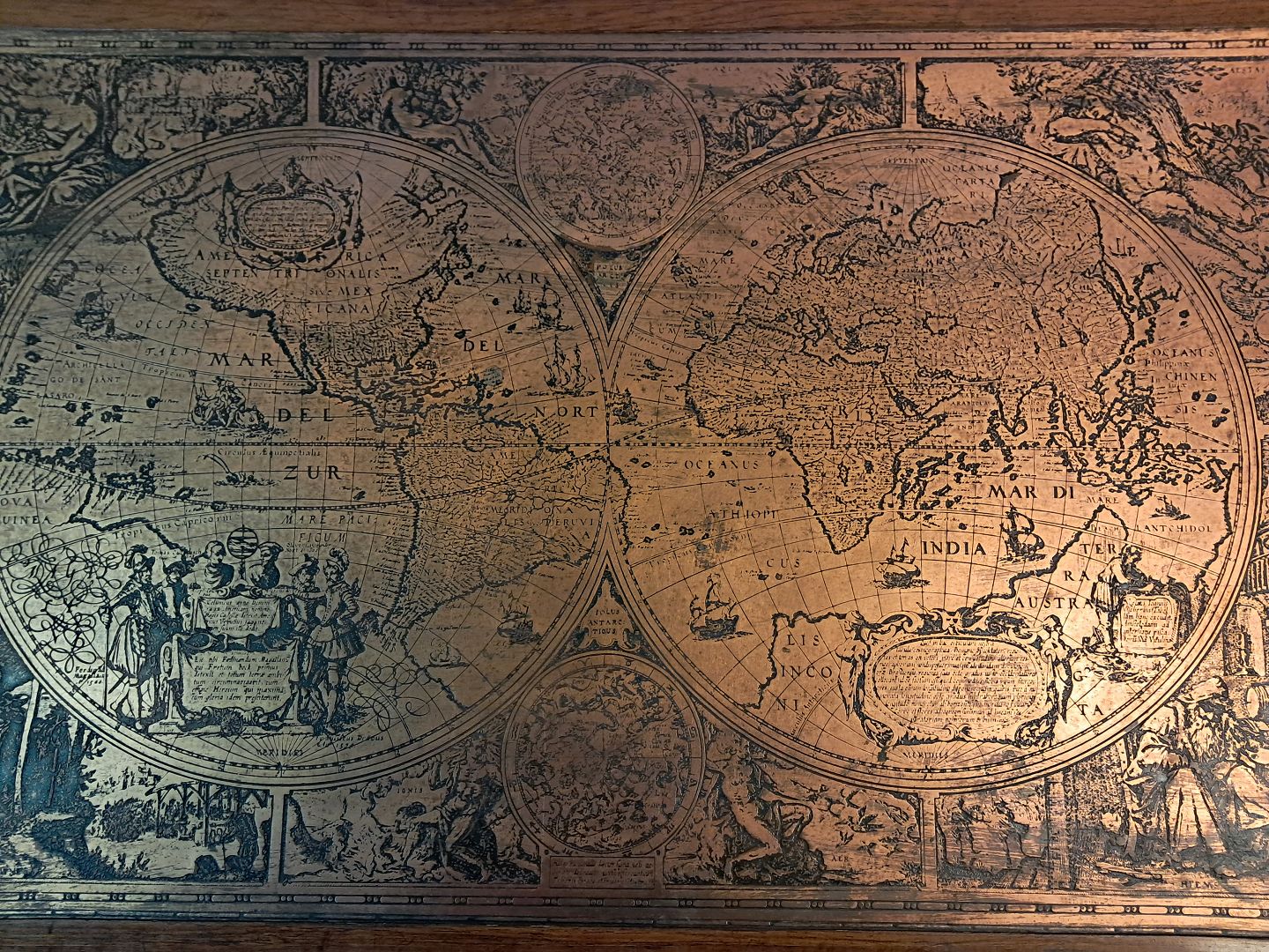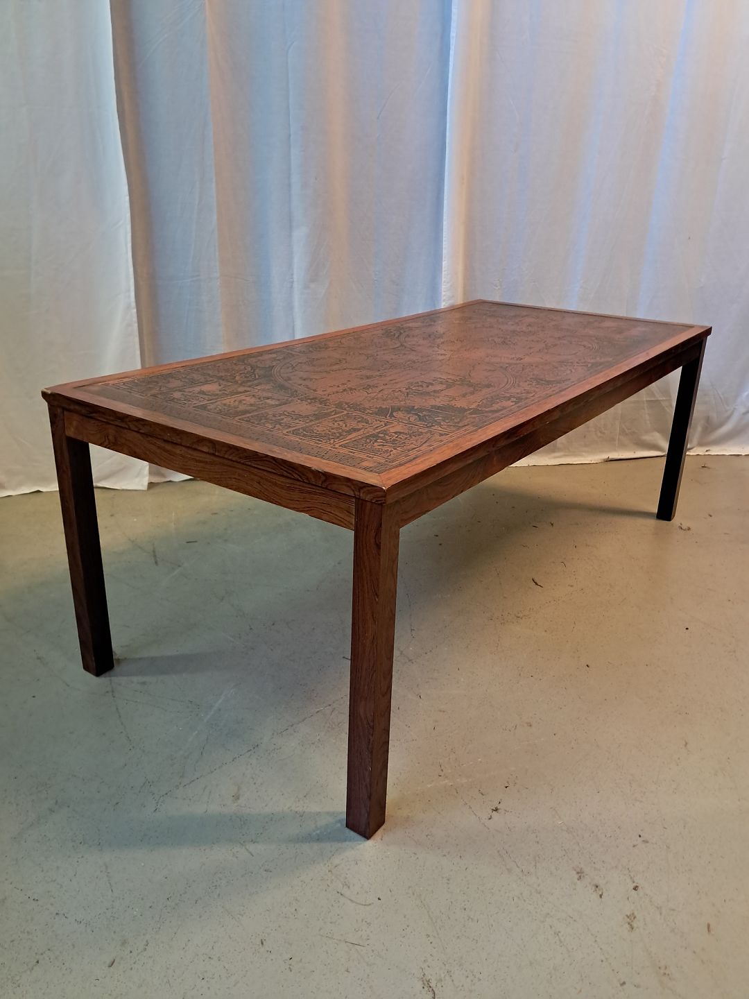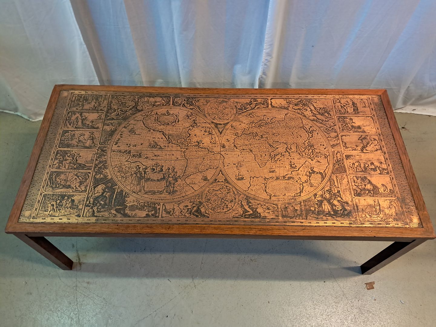 Sofabord i fineret palisander med verdenskort på metalplade, fra 1970erne.