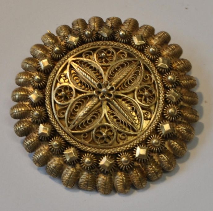 Norsk forgyldt sølv brosche i med filigran, Tostrup, Kristiania (Oslo), 1885, Norge. Stemplet. Dia.: 4,5 cm.