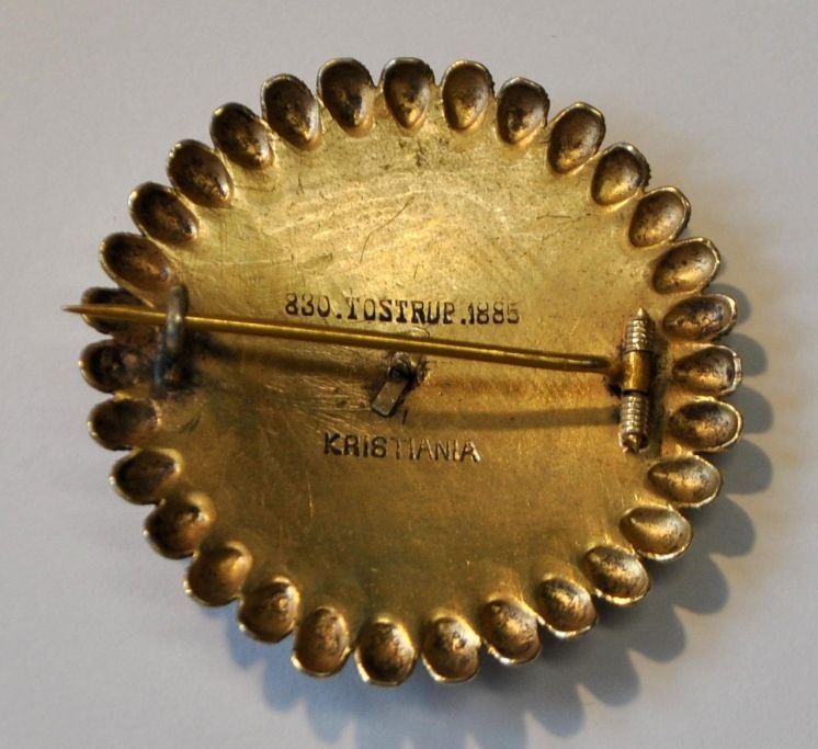 Norsk forgyldt sølv brosche i med filigran, Tostrup, Kristiania (Oslo), 1885, Norge.