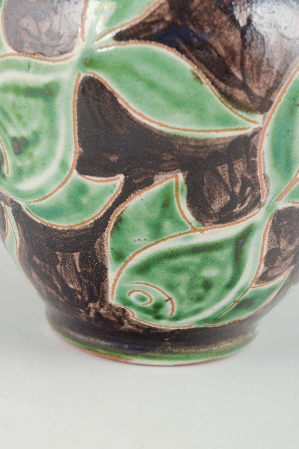 Dekorativ vase i glaseret lertøj med reliefdekoration forestillende fisk og tang i grønne og brune nuancer. Et karakteristisk eksempel på dansk midt-århundredes værkstedsproduktion med naturinspirerede motiver og livlig farvekontrast.