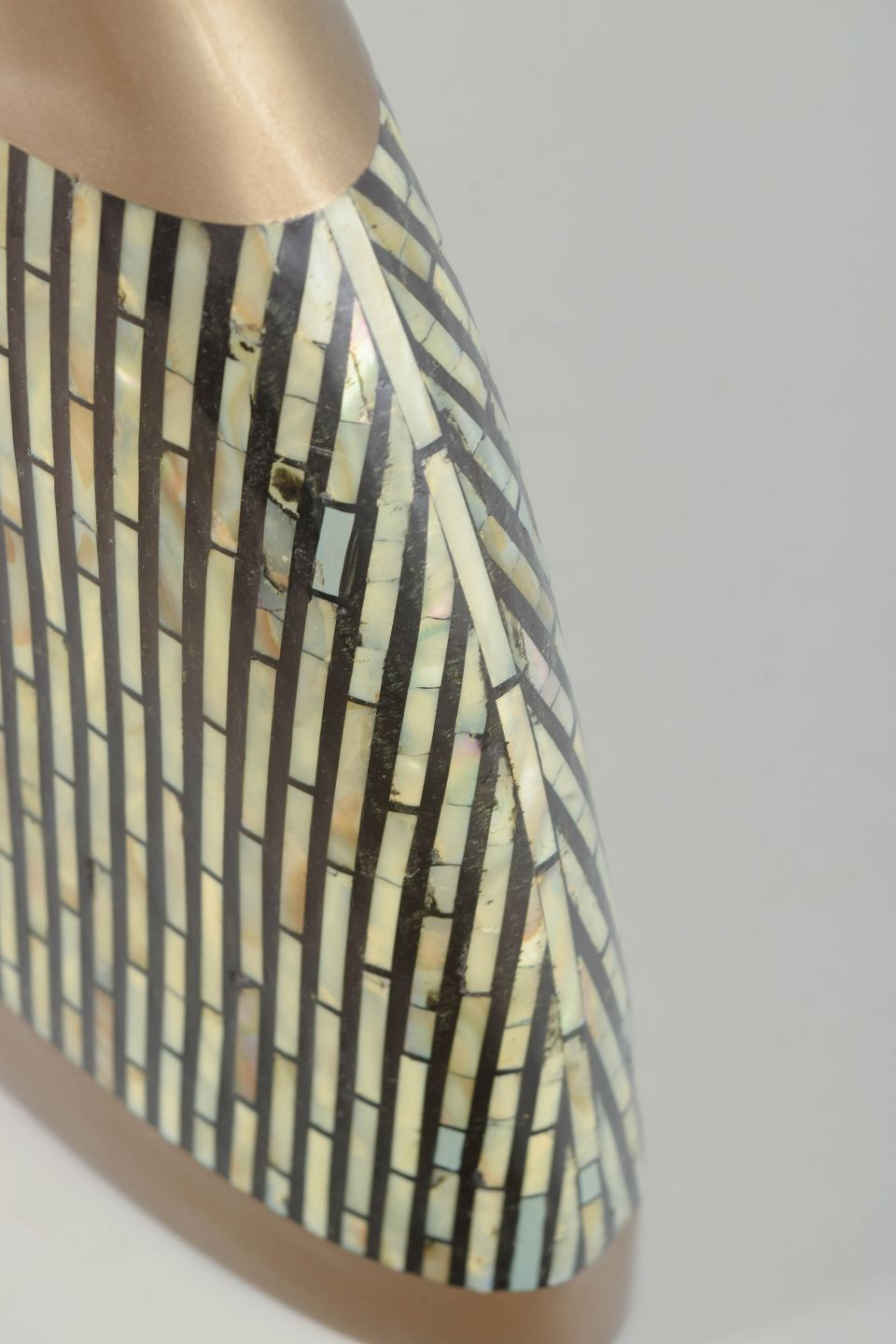 Imponerende, skulpturel studiovase i glaseret keramik med geometrisk mosaikdekoration i metalliske og lyse toner. Den brede, asymmetriske form og den reflekterende glasur giver vasen et markant, dekorativt udtryk typisk for 1980’ernes europæiske studiokeramik.