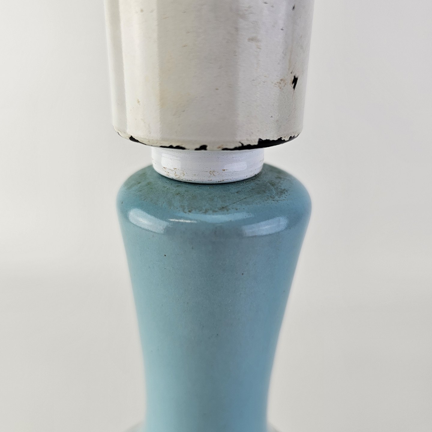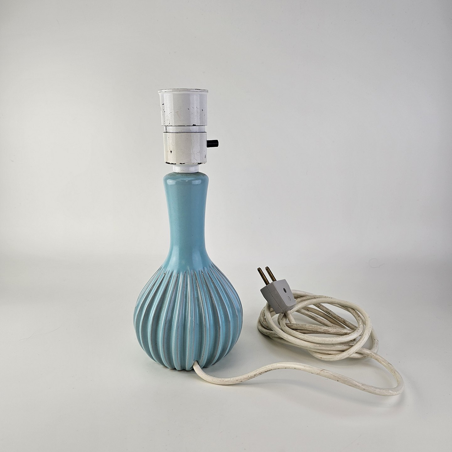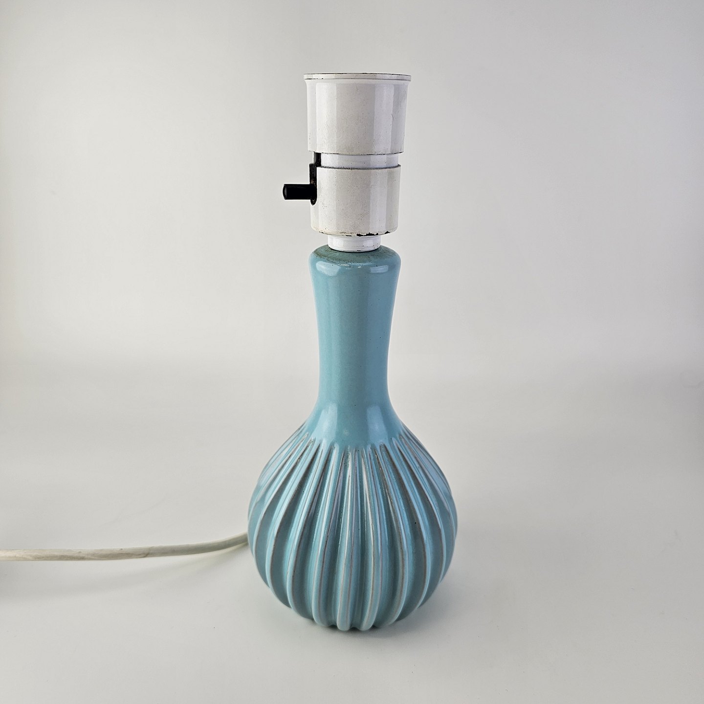 Rund bordlampe i rillet grønblå keramik med hvid fatning
