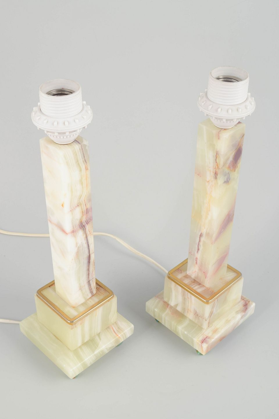 Elegant par bordlamper i poleret onyx med naturlige årer i grønne, rosa og cremefarvede toner. Fod og top i messingdetaljer, monteret på små kugleben i glas. Klassisk italiensk design med tydelig reference til Volterras stenhuggertradition.