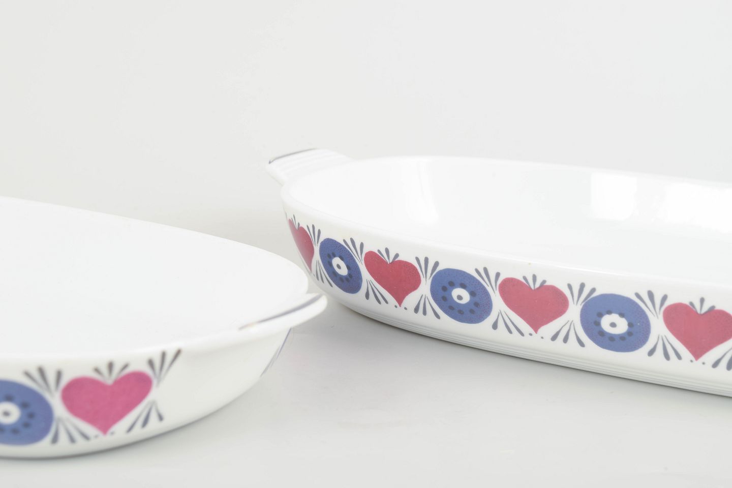 Dekoreret med Westmans karakteristiske retroblomstermotiv i blå og rosa på hvid bund. Serien Silja blev lanceret i 1960’erne som en del af Rörstrands funktionelle “El-Fast” stentøj, velegnet til både ovn og bord.