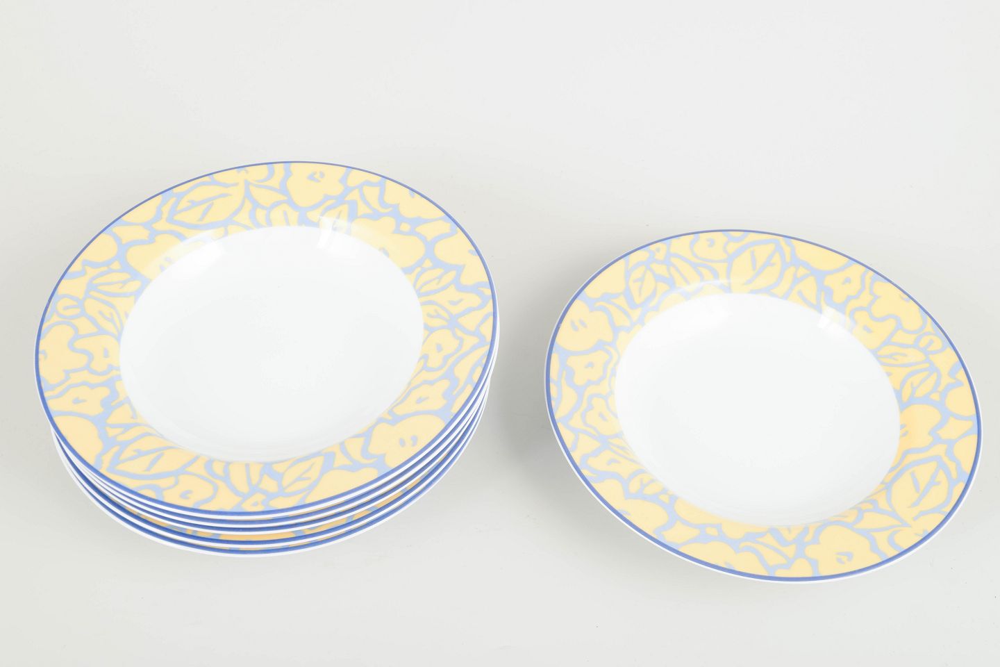Porcelænstallerkener med karakteristisk bred gul kant med blå konturer i blomstermotiv, et eksempel på Graves’ postmoderne formsprog for Alessi i perioden.