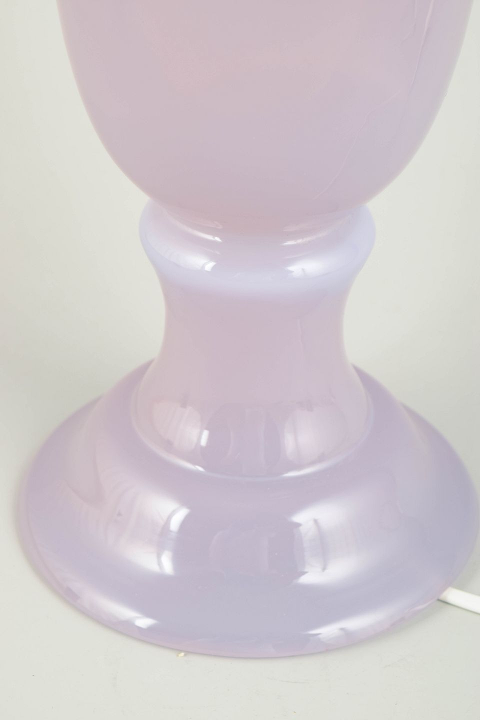 Elegant bordlampe i mundblæst glas med blød turkis/lilla tone og klassisk urneformet fod. Original fatning, ledning udskiftet senere.