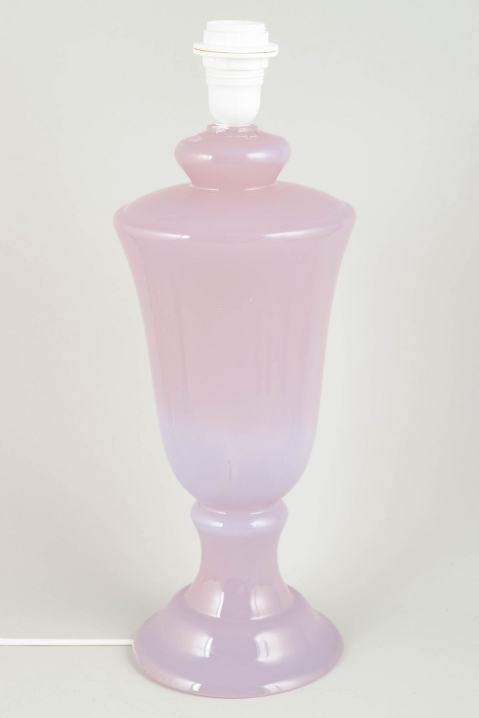 Elegant bordlampe i mundblæst glas med blød turkis/lilla tone og klassisk urneformet fod. Original fatning, ledning udskiftet senere.