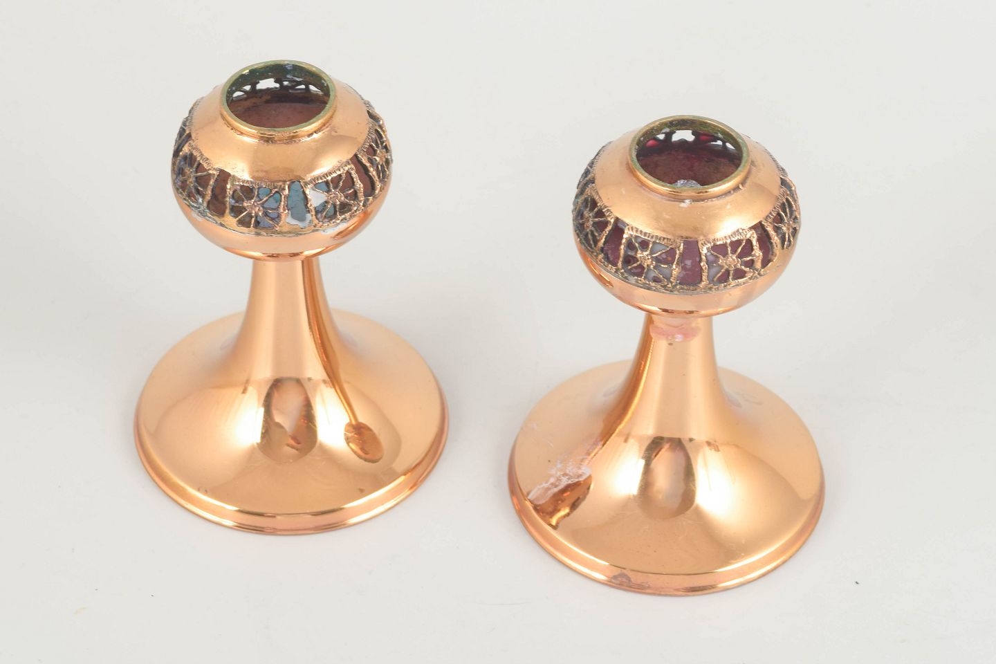 Elegant par lysestager i messing med dekorativ emalje i mørkegrønne og sorte nuancer omkring toppen. Den skulpturelle form fremhæver den nordiske modernismes raffinerede udtryk.