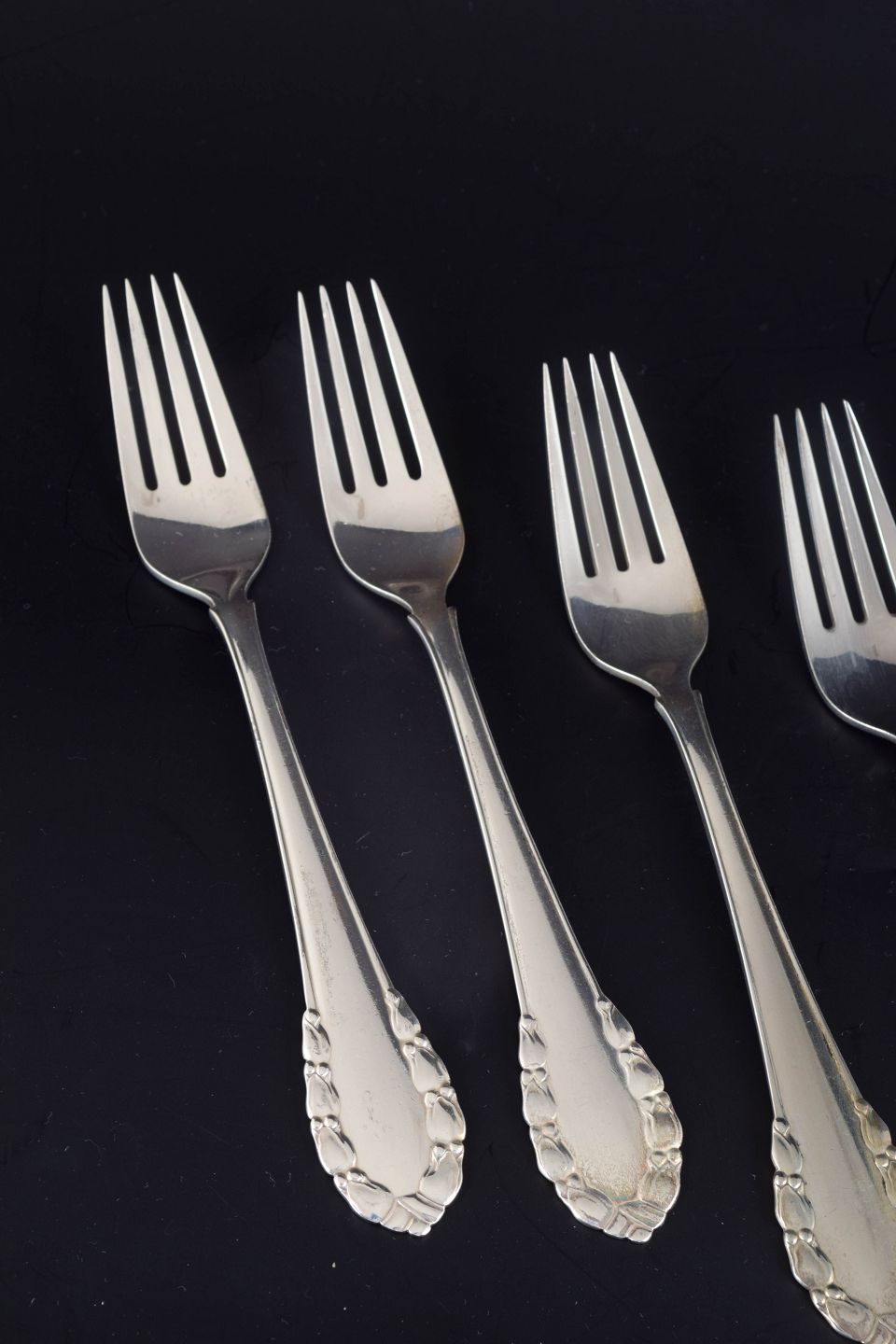 Set of five sterling silver dinner forks by Georg Jensen in the classic “Lily of the Valley” pattern. Elegantly crafted with soft lines and floral ornamentation in the Art Deco style. Stamped “GEORG JENSEN STERLING DENMARK”.