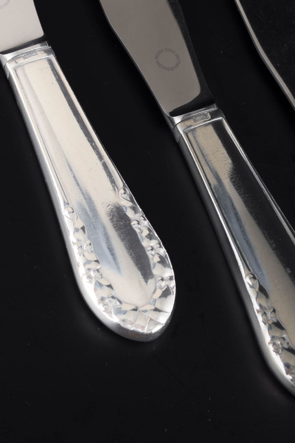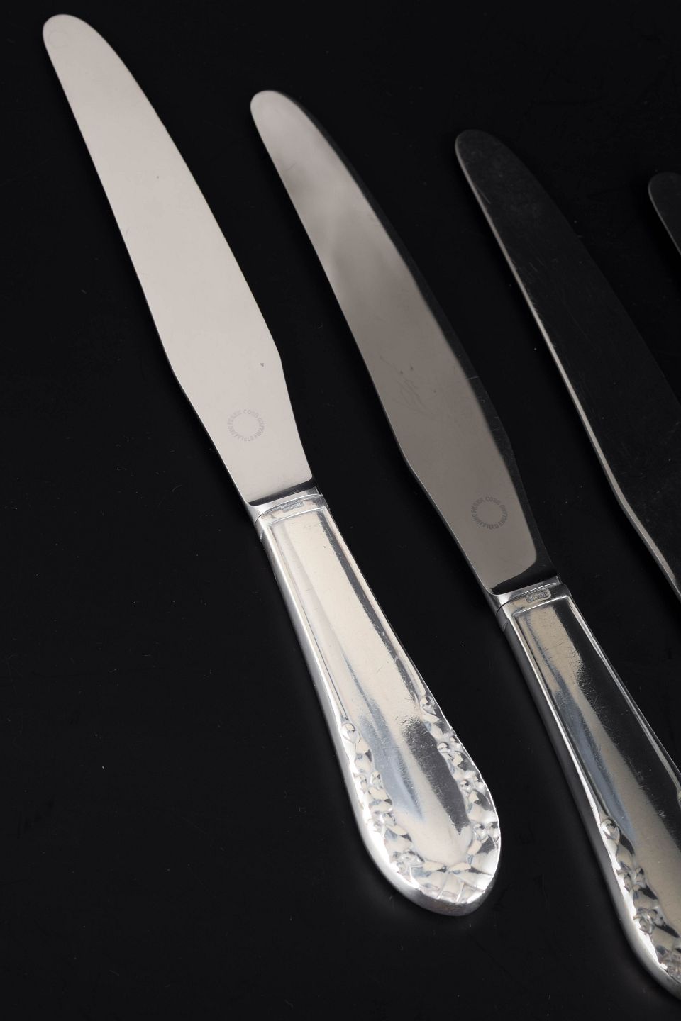Sæt med fem middagsknive i klassisk “Liljekonval”-mønster. Knivene har lange klinger i rustfrit stål og skæfter i sterlingsølv, udført i elegant art deco-stil med blomsterornamentik.