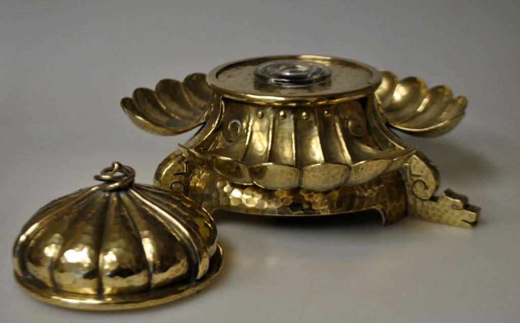 Stort messing blækhus, art deco, ca. 1920, Danmark.  Med dragefødder. Hamret. Indvendig ed glas blækhus. H.: 14 cm. Dia.: 22 cm.