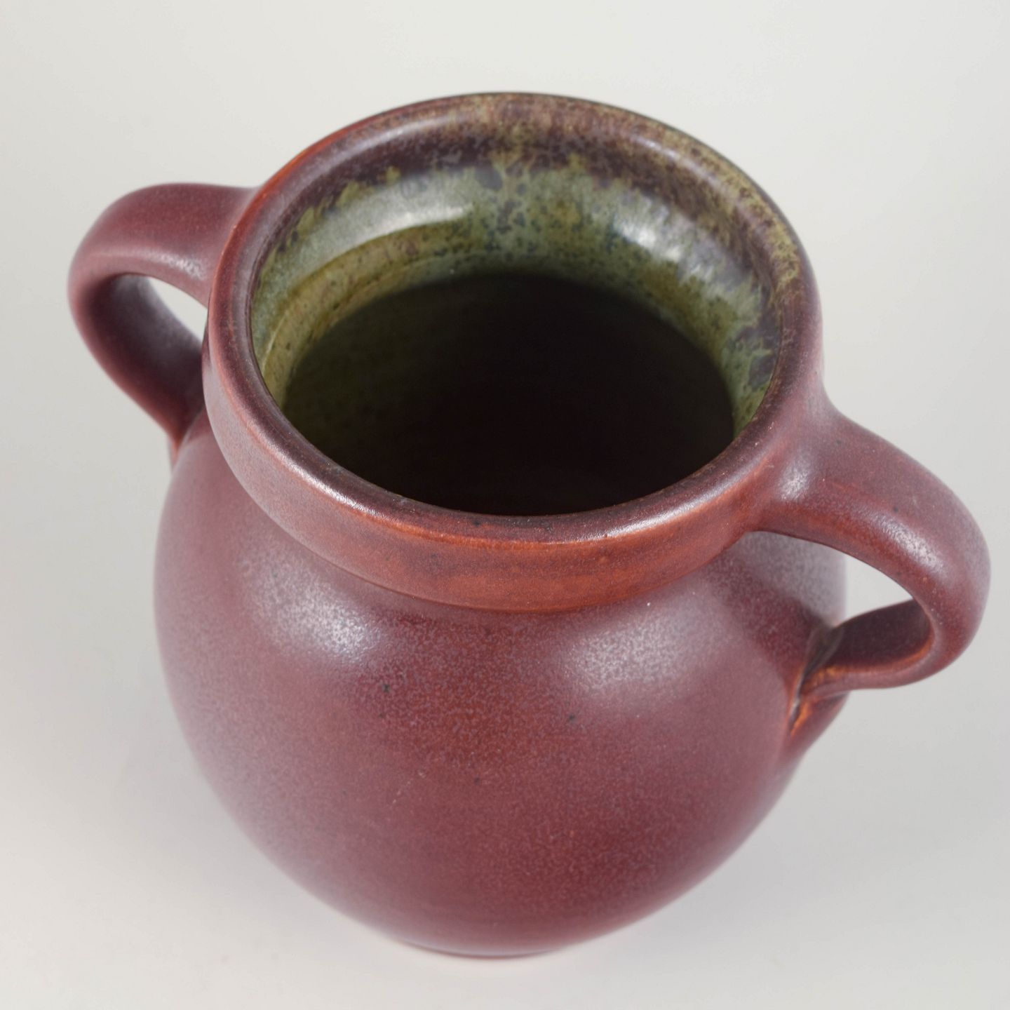 Hånddrejet stentøjsvase i dyb rødviolet glasur med let spil og smukt kontrasterende, flerfarvet indre glasur. Klassisk, blødt buet korpus med elegante dobbelthanke.