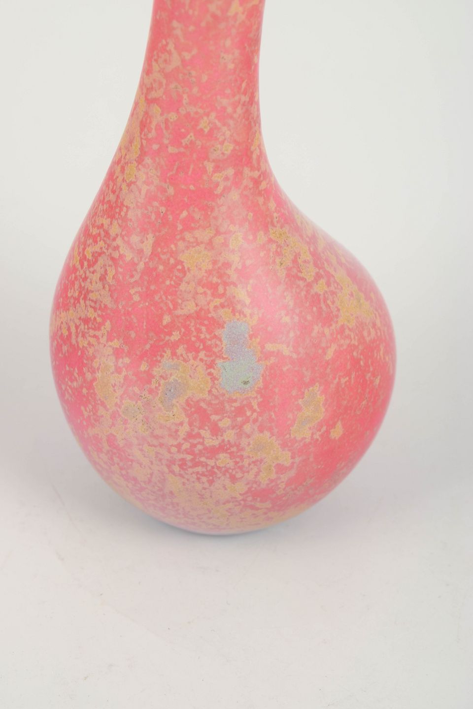 Elegant drop-shaped ceramic vase with a characteristic marbled pink and yellow glaze. The slender neck and rounded body give the piece a sculptural presence.