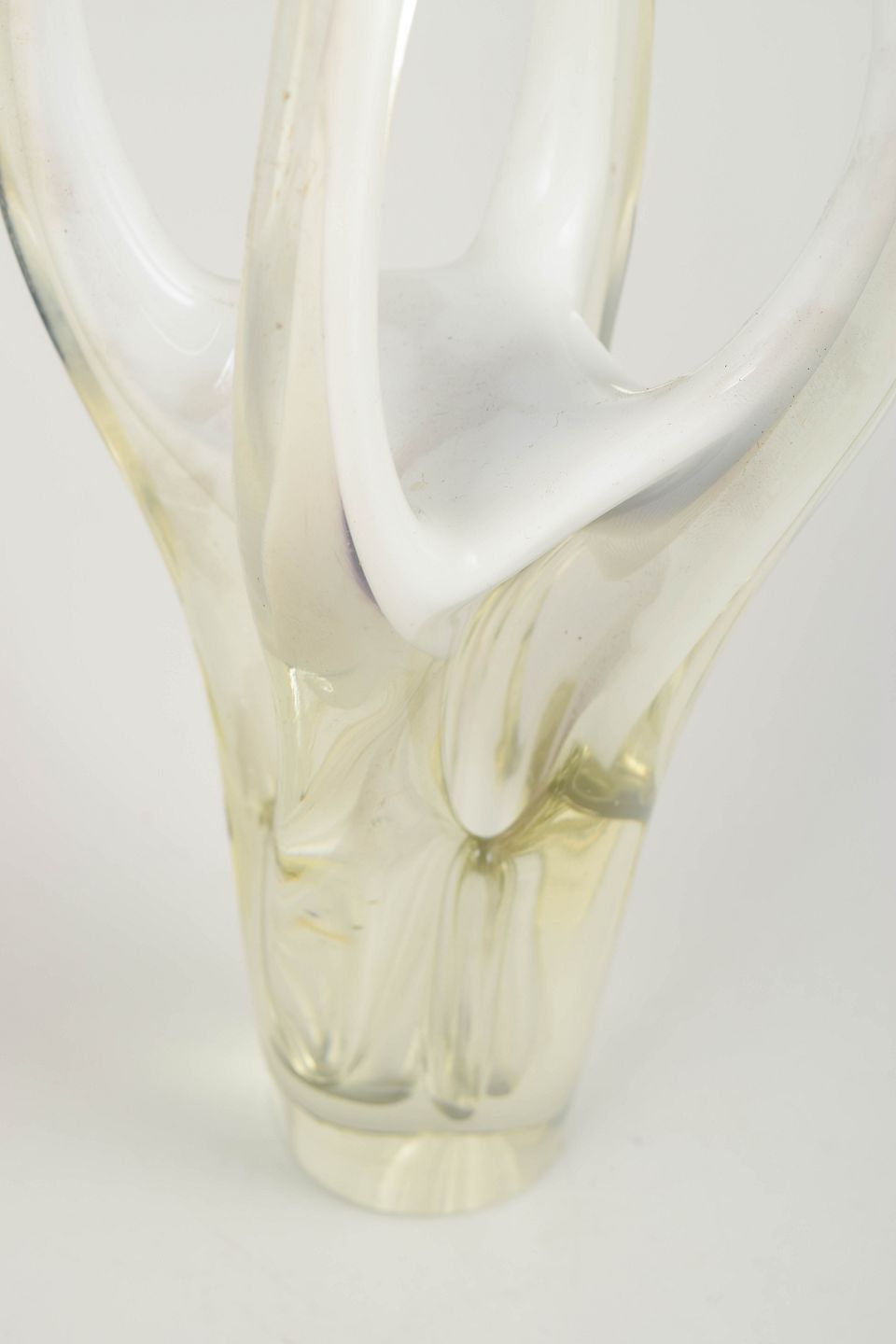 Imponerende fler-armet form i klart kunstglas med let gylden nuance. Den høje, opadstræbende silhuet og de snoede, organiske arme giver et markant, næsten abstrakt skulpturelt udtryk – en sjældnere variation inden for Kedelvs Coquille-arbejder.