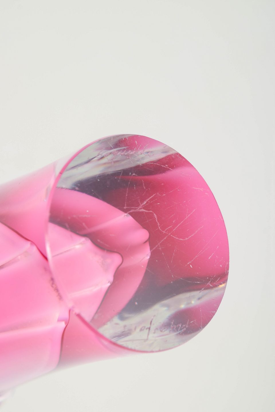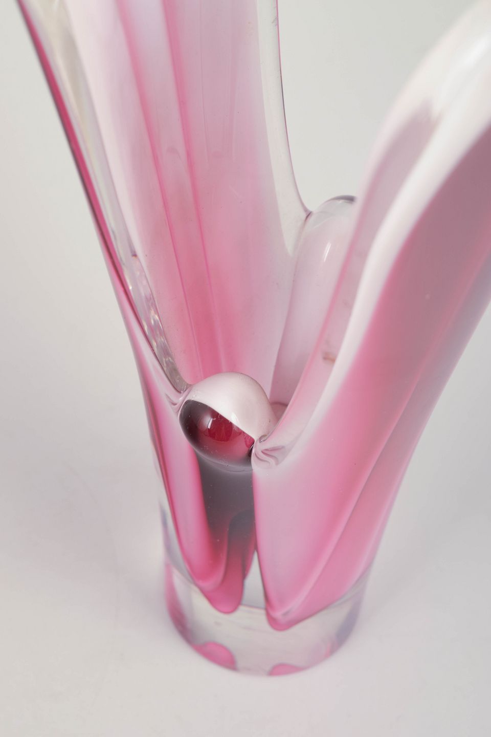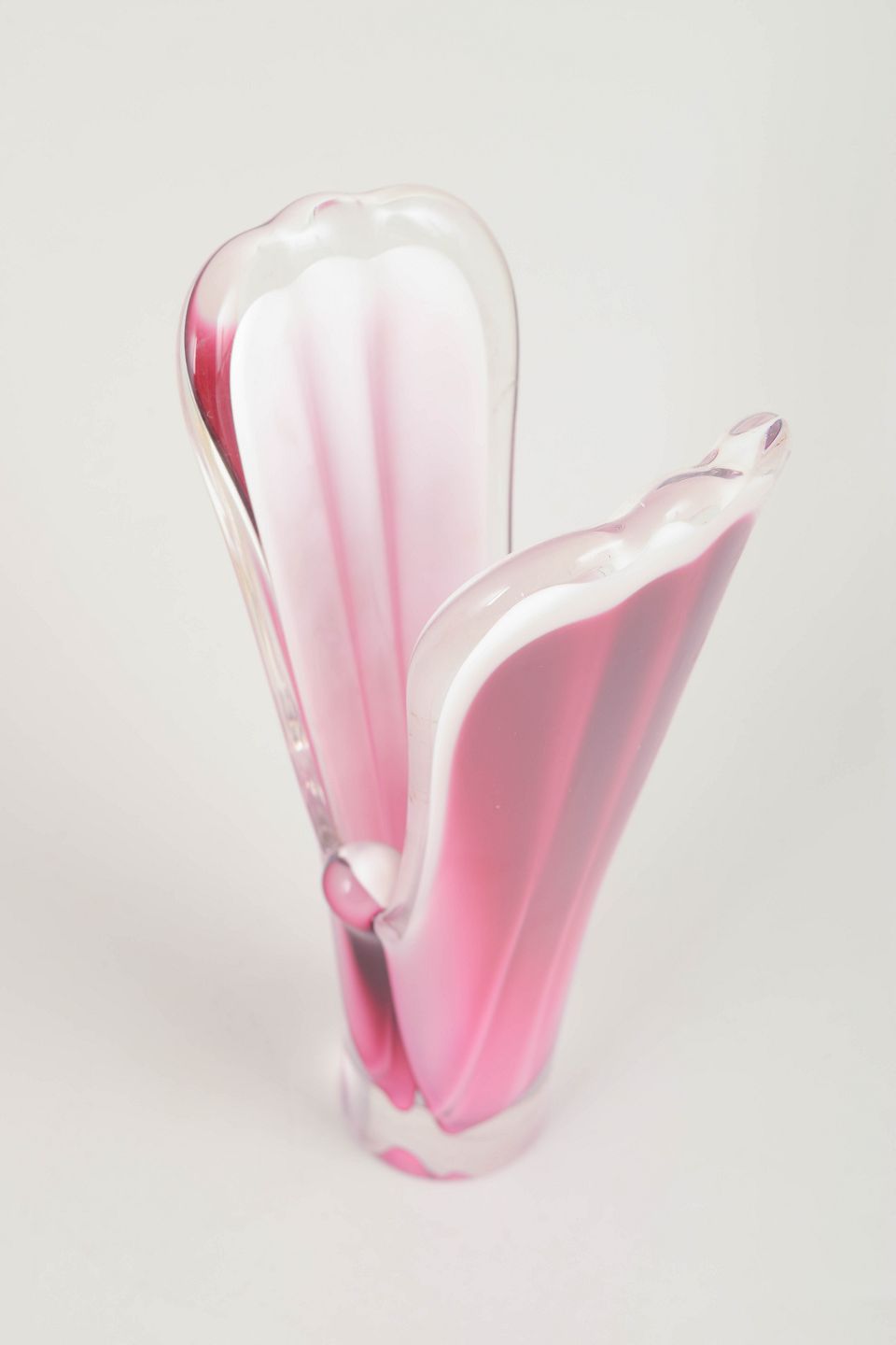 Skulpturel “Coquille”-vase i klart glas med indre lag i rosa og hvidt, karakteristisk for Kedelvs organiske formsprog hos Flygfors.