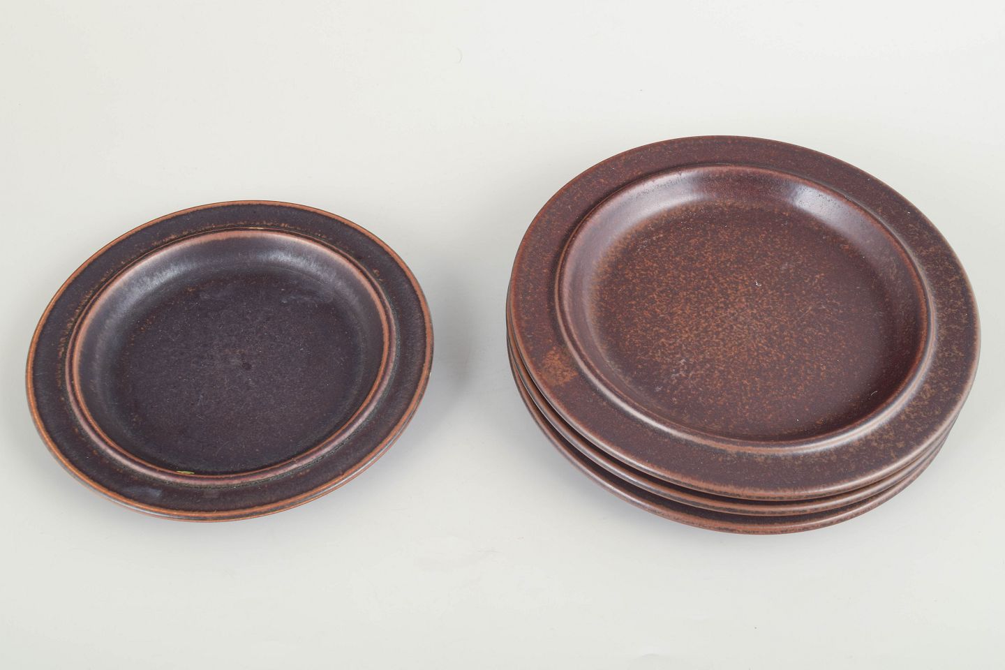 Fire mindre tallerkener i den ikoniske “Ruska”-serie, udført i mørkebrunt stentøj med den karakteristiske matte jernglasur, som varierer smukt i overfladens tone og struktur.
