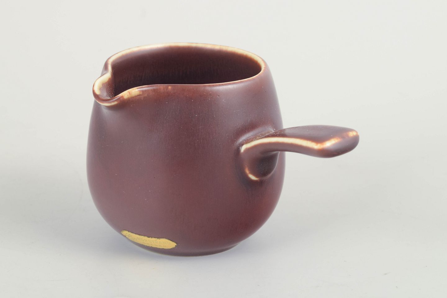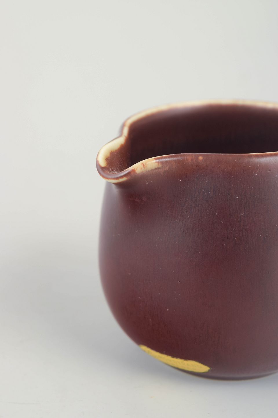 Elegant lille flødekande i rødbrun, mat glasur med afrundet korpus og karakteristisk sidehåndtag – et formsprog, der er typisk for Nylunds skulpturelle og funktionelle design. Den varme glasur og de bløde linjer giver genstanden et harmonisk, moderne udtryk.